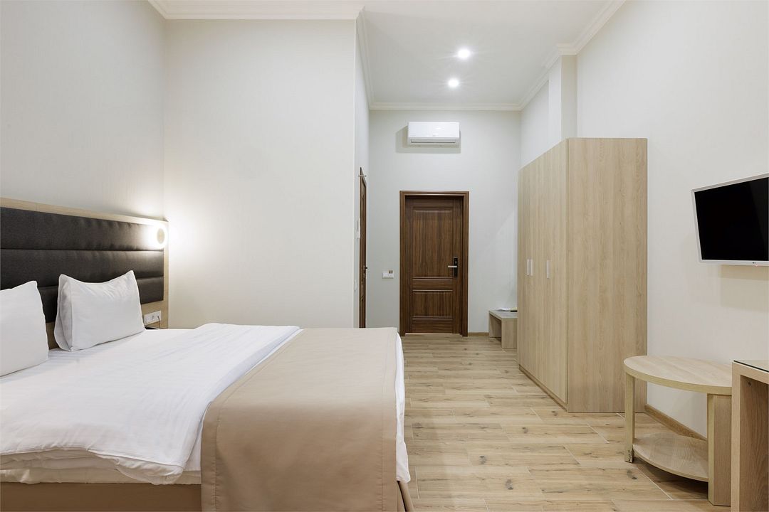 Wi-Fi, кондиционер, фен, душевая кабина, санузел, банные принадлежности, банные полотенца, тапочки, двуспальная кровать, шкаф для одежды, вешалки, багажная тумба, зеркало, обслуживание номеров, сейф, унитаз, раковина, отопление, кулер на этаже, вид во двор, стаканы, стул, стол, туалетные средства, цифровое тв, телевизор с плоским экраном, мини-холодильник, пуфик, рабочий стол, общественный бассейн, онлайн-регистрация до заезда, чайная станция, уборка номера, мыло, без видаВ гостиничном номере