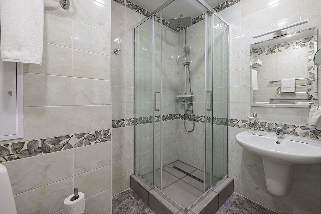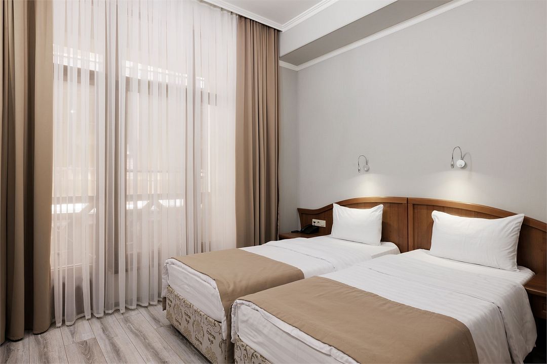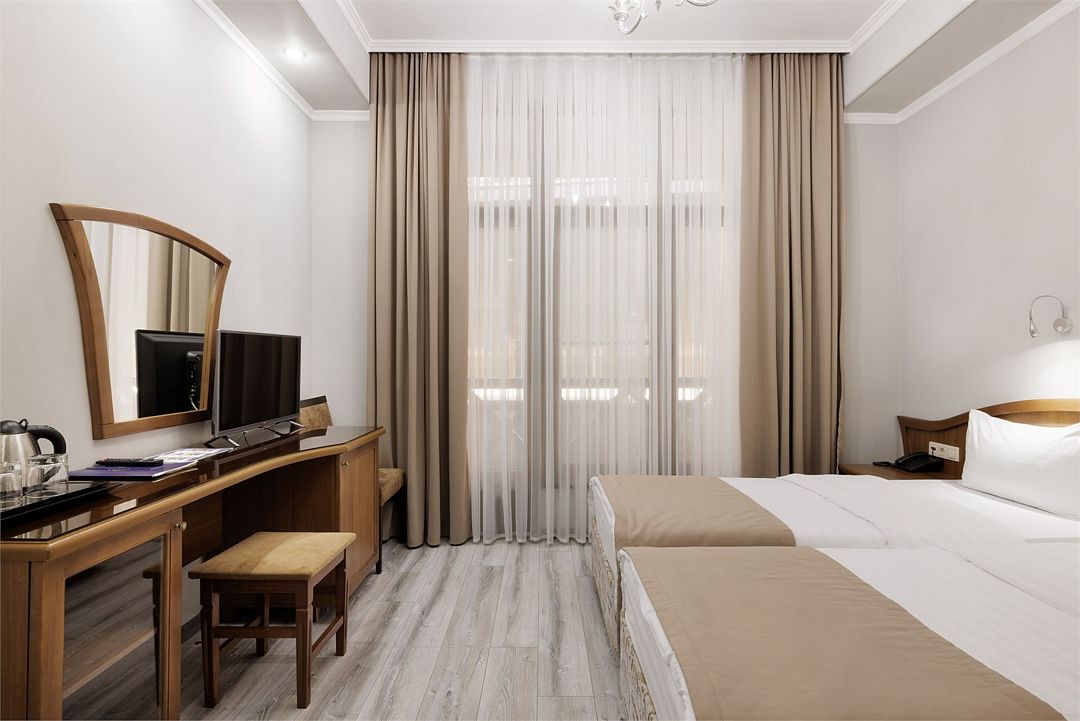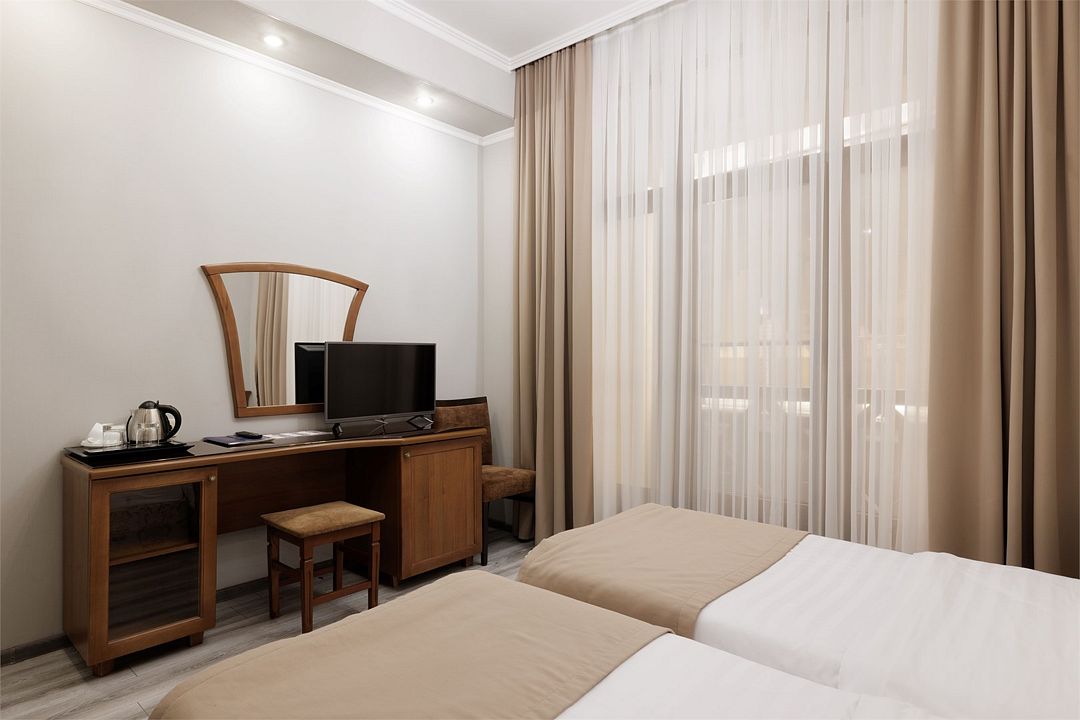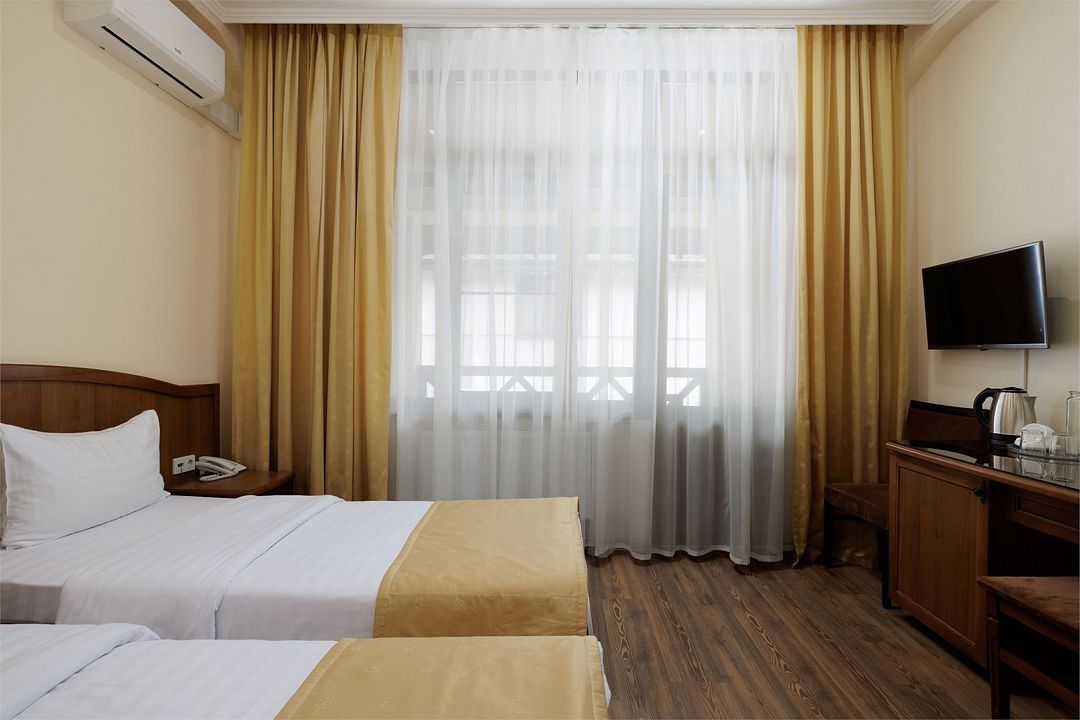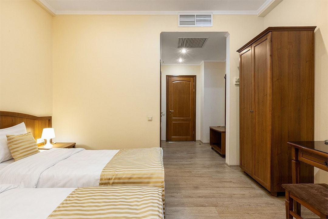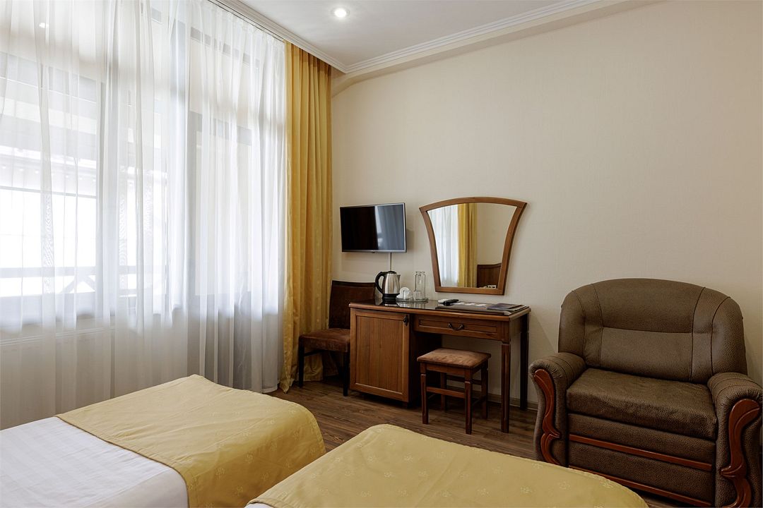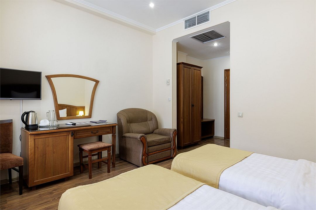 Двухместный, однокомнатный номер c балконом, две односпальные кровати с прикроватными тумбочками, шкаф, журнальный столик, туалетный столик, телевизор, холодильник. Ванная комната с комфортабельной душевой кабиной, фен, тапочки. Халаты в номерах категории Стандарт предоставляются за дополнительную плату.Услуги и удобства
