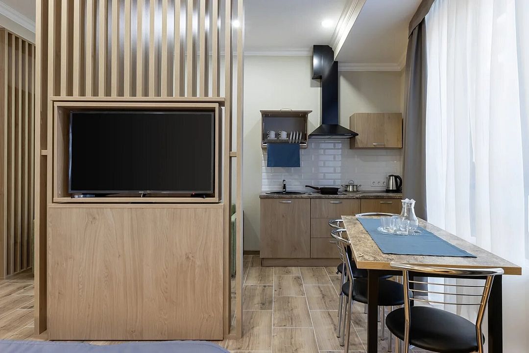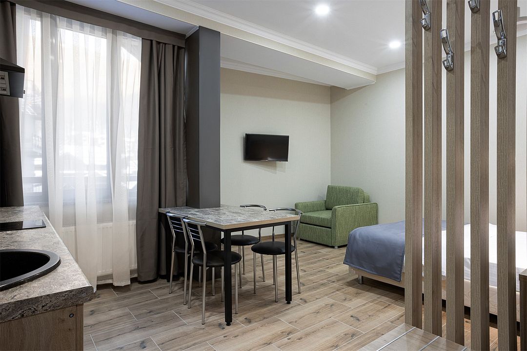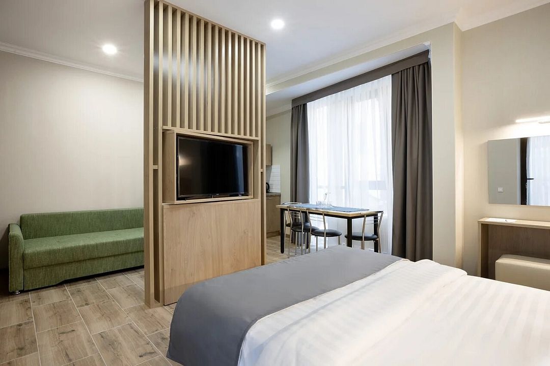 кабельное телевидение, Wi-Fi, кондиционер, светильник, настольные лампы, фен, плита для приготовления пищи, банные принадлежности, халаты, банные полотенца, тапочки, косметические средства, балкон, балкон с красивым видом, двуспальная кровать, шкаф для одежды, вешалки, обеденный стол, зеркало, чайный набор, обслуживание номеров, сейф, чайник, питьевая вода, отопление, душ, вид на город, кулер на этаже, вид во двор, ламинат, кухонная посуда, столовые приборы, стул, стол, туалетные средства, туалет, сушилка для белья, раскладной диван, телевизор с плоским экраном, мини-холодильник, мини-кухня, вид на горы, общественный бассейн, онлайн-регистрация до заезда, набор для приготовления чая и кофе, бутилированная водаВ гостиничном номере
