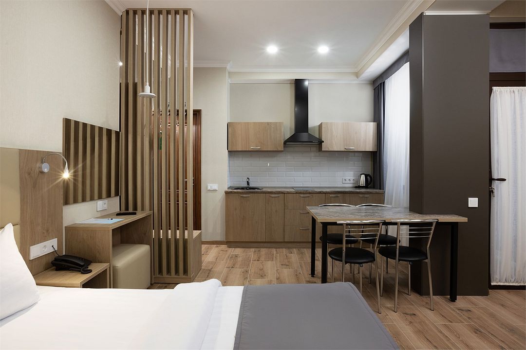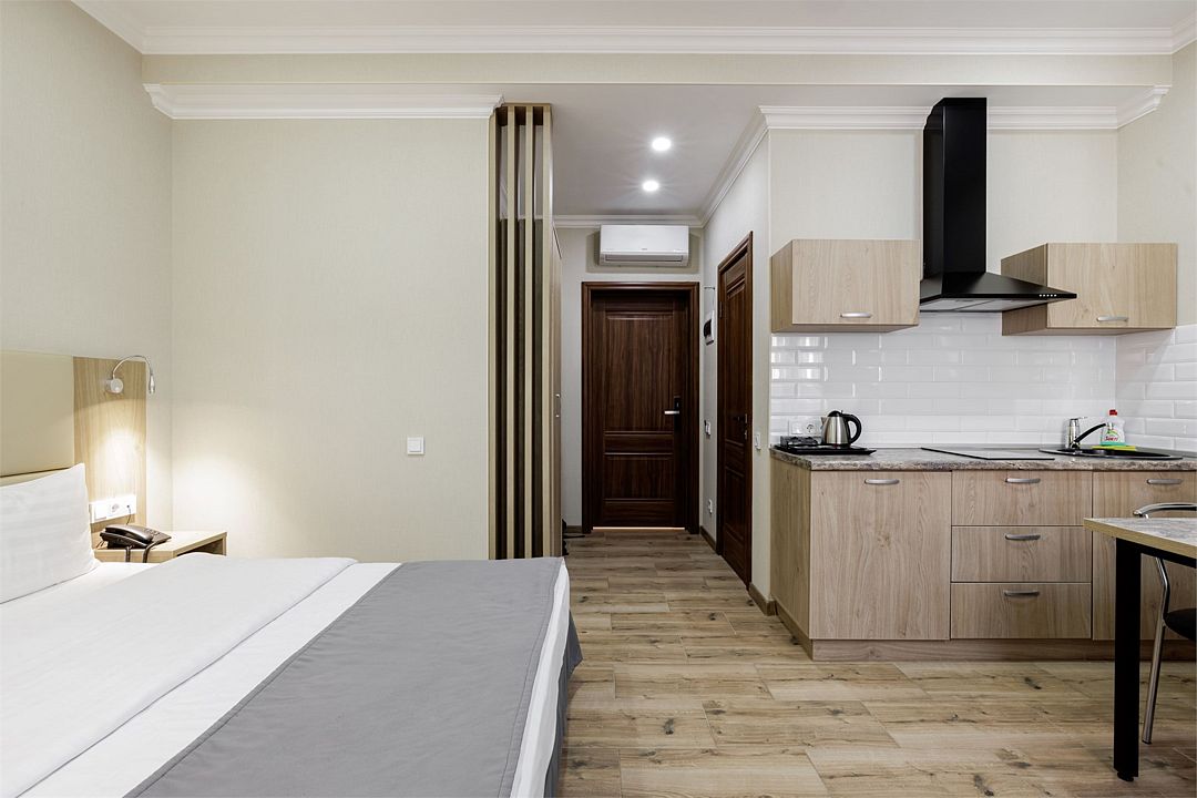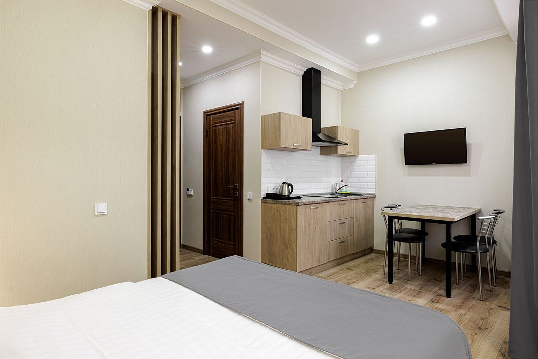 Однокомнатный номер с двуспальной кроватью и прикроватными тумбочками. Балкон в номере. Кухонный модуль, кухонный инвентарь, обеденный стол и стулья, чай/кофе, сахар, бутилированная вода. Ванная комната: душ, санузел, раковина, полотенца, фен, ванные принадлежности. Халаты и тапочки в номере.Услуги и удобства