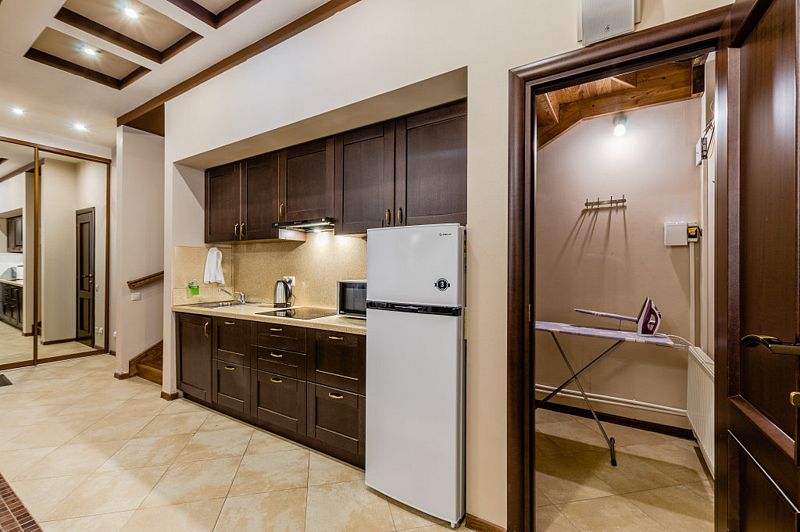 - полностью оборудованная кухня-гостиная с обеденной зоной, техникой, посудой и раскладным диваном;
