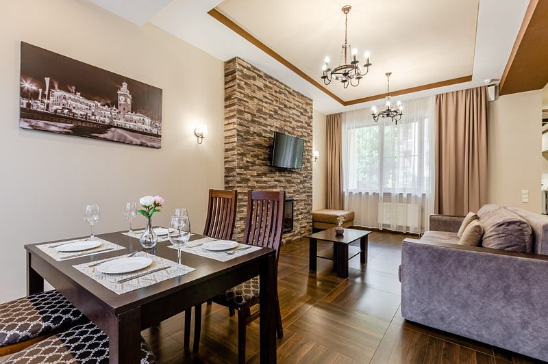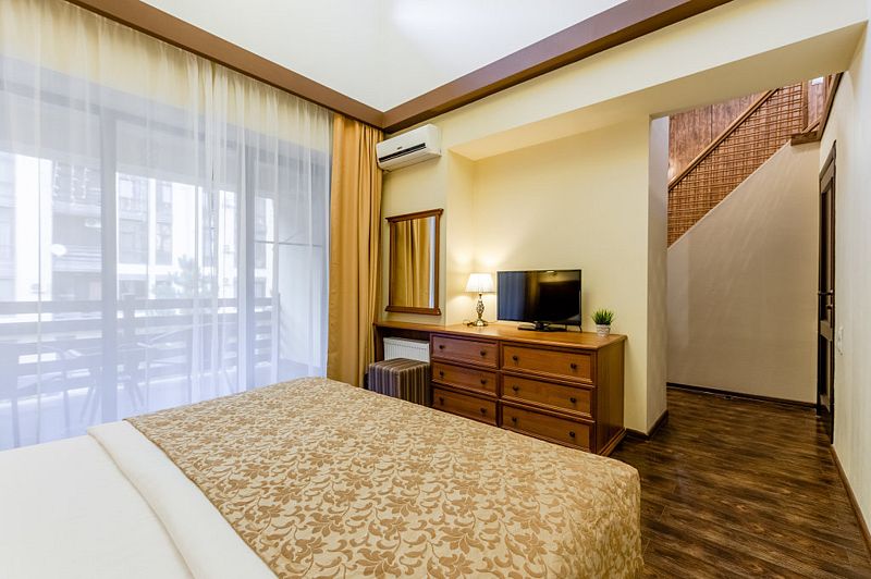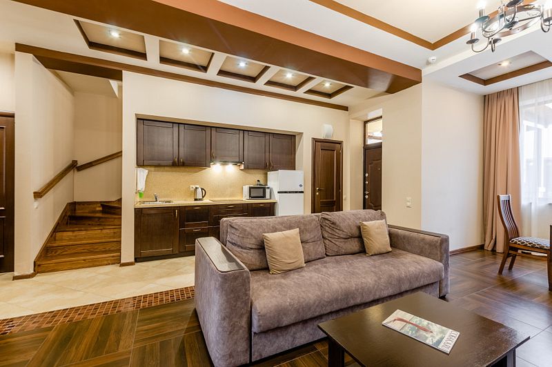 Путешествие с семьейЖить хорошо! А хорошо жить - ещё лучше!Доброго дня, всем! Как театр начинается с вешалки, так любая гостиница начинается с рецепции. Сразу, в начале рассказа, хочу отметить и поблагодарить девушек с рецепции, которые вас встречают и провожают, решают возникающие вопросы и стараются сделать ваш отдых максимально комфортным! Это как раз то место, где именно так и происходит! Ни одна просьба не осталась незамеченной, за что большое спасибо! Так.. Выходим с рецепции и идём в номер, который здесь представлен двухэтажным блоком в таунхаусе.. И здорово представлен, хочу вам сказать! Внутри есть всё, что может понадобиться: тапочки, косметика для ванны, несколько телевизоров и прекрасная терраса с мангалом! Несколько ванных и уборных комнат и конечно просторная гостиная! В общем проживание очень комфортно, в независимости от времени года! Из минусов могу отметить только отсутсвие собственного кафе или столовой (хотя кому то это плюс)); небольшую нерасторопность уборщицы (уборка средняя, но только уборка, так как полотенца и белье абсолютно чистые) и цена (стоимость проживание не гуманная)! Но.. В нашей стране любят драть деньги не за что, так что обычно приходится мирится с этим, если хочешь жить и отдыхать по красоте! В итоге: однозначно рекомендую к проживанию!