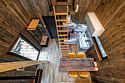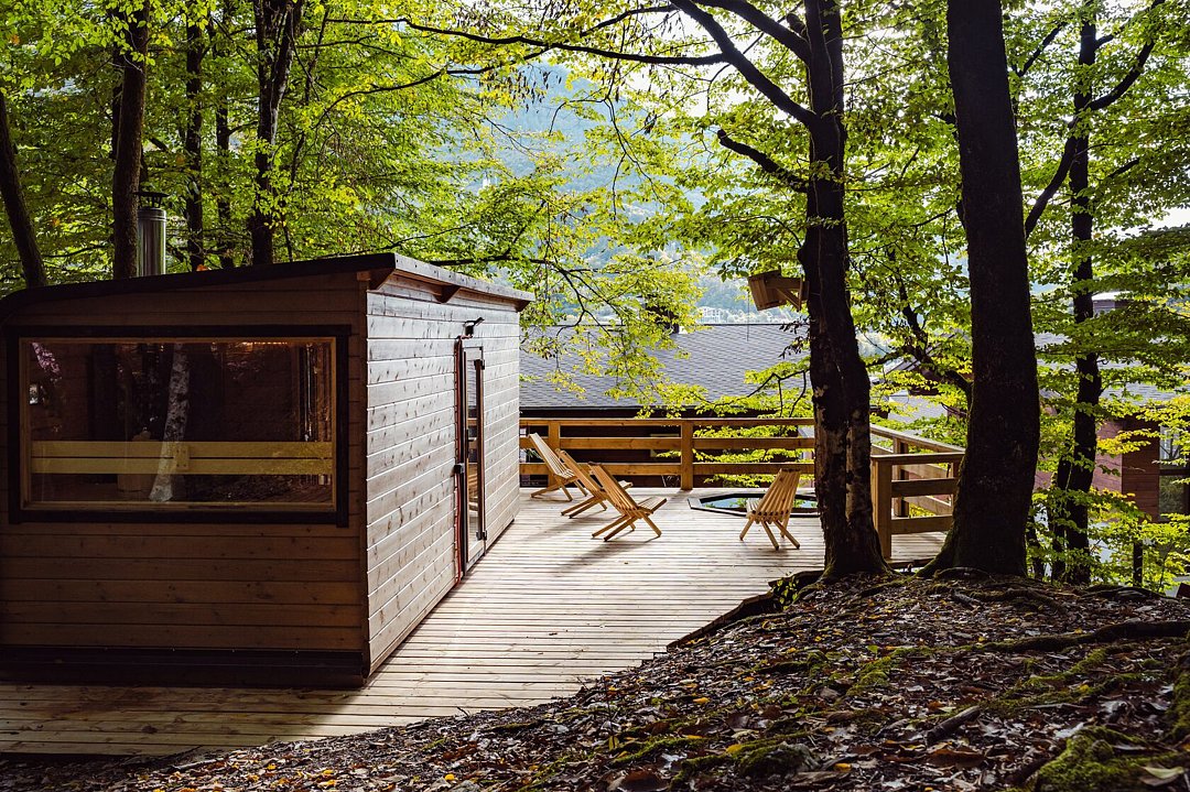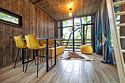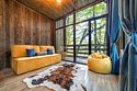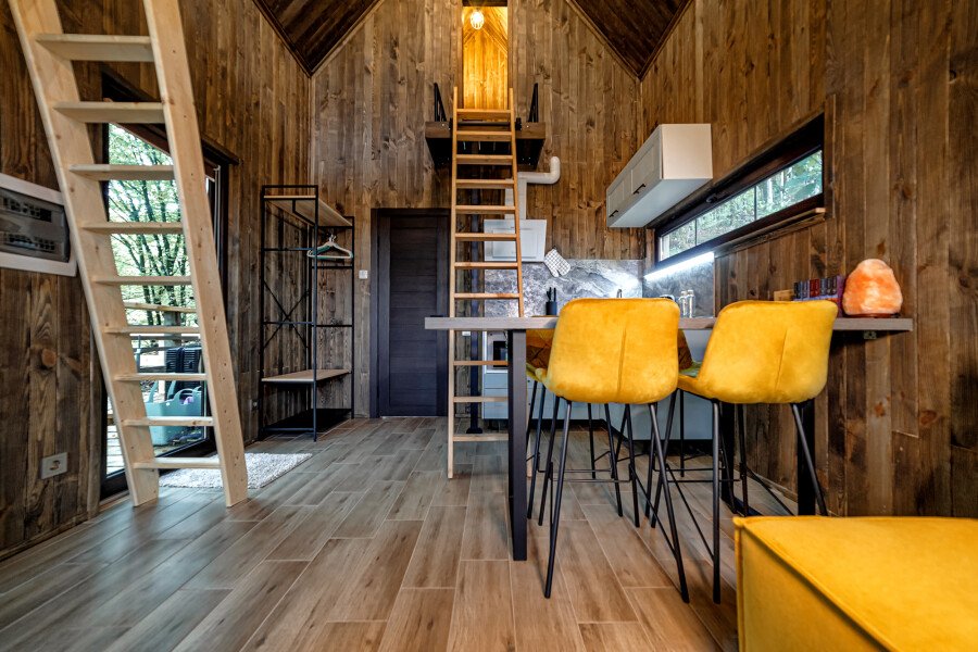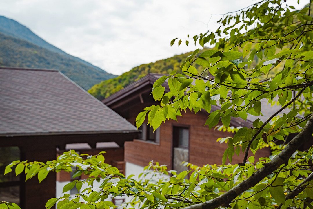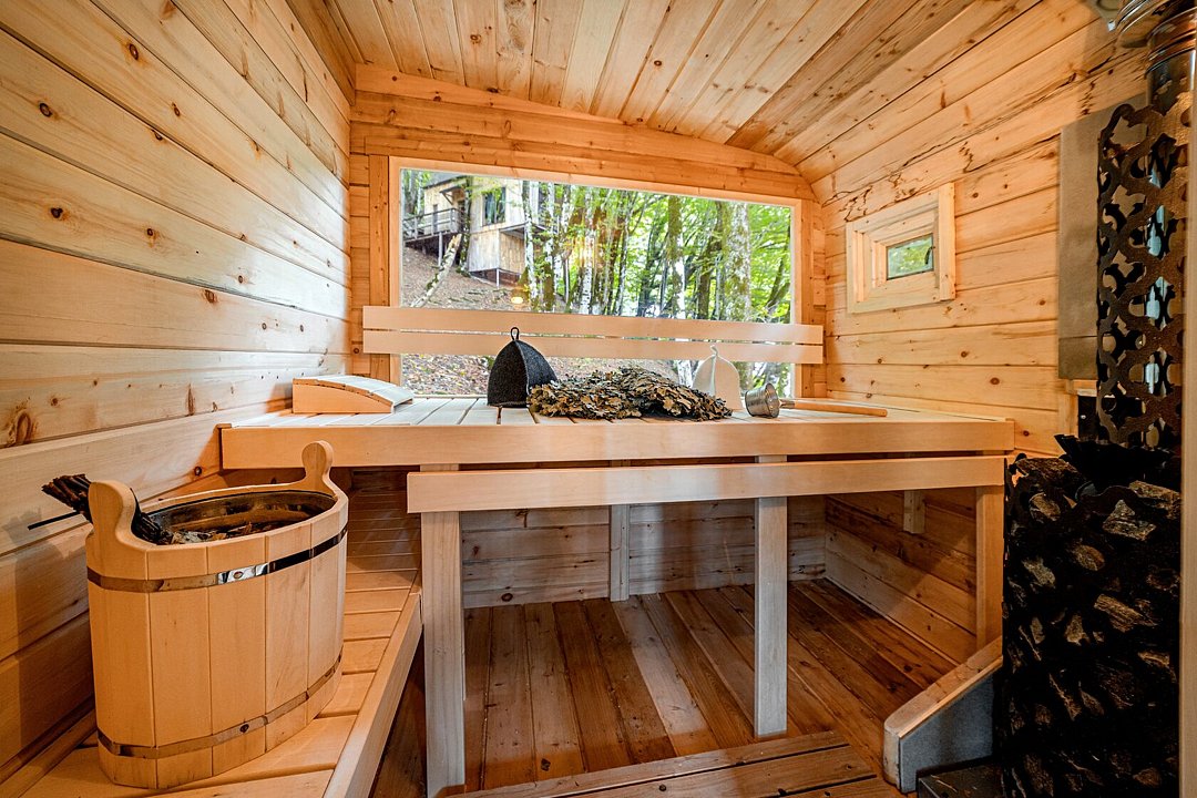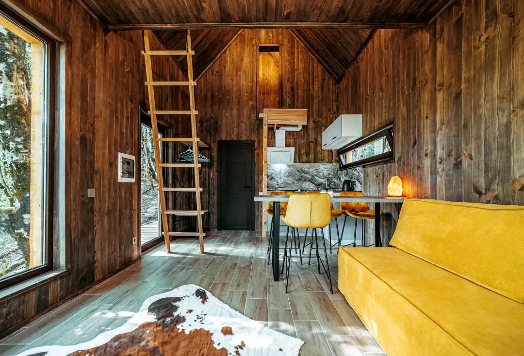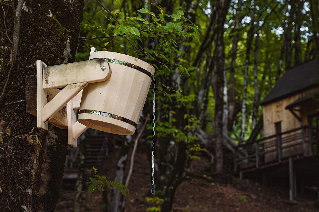 На лесном склоне ювелирно вписаны в рельеф 2 деревянных домика на деревьях по типу глэмпинга. Каждый дом таит в себе множество сюрпризов. Из окон открывается потрясающий вид на пышный лес, через кроны деревьев проглядывают снежные горы. Интерьер в стиле горной хижины дополнен различными приятными мелочами. Домики прекрасно оборудованы мебелью, кухней и необходимой техникой для комфортного пребывания.