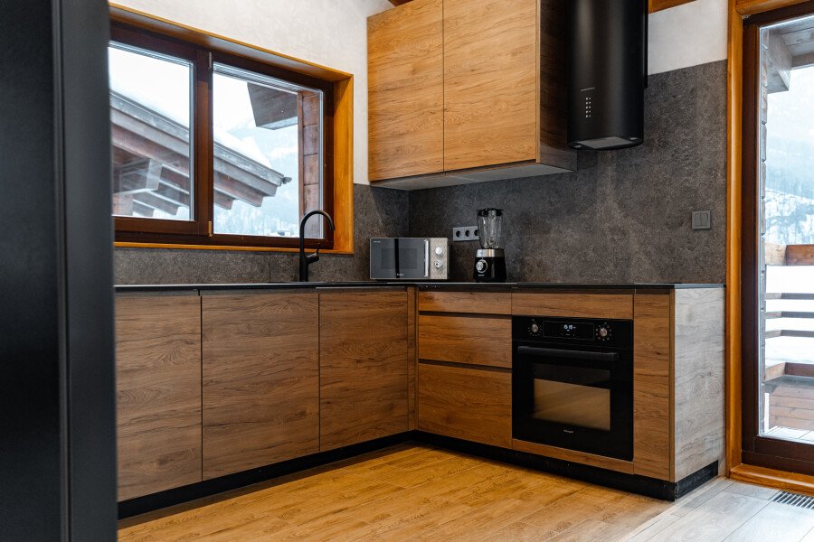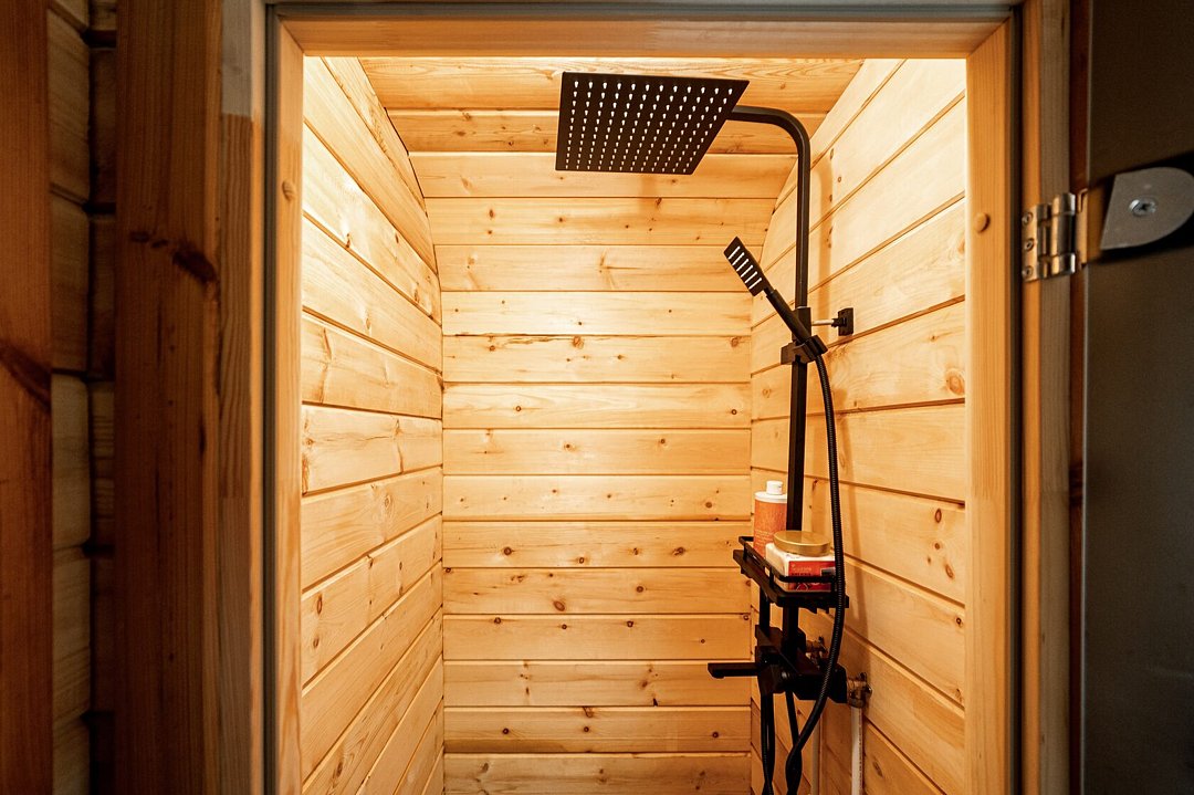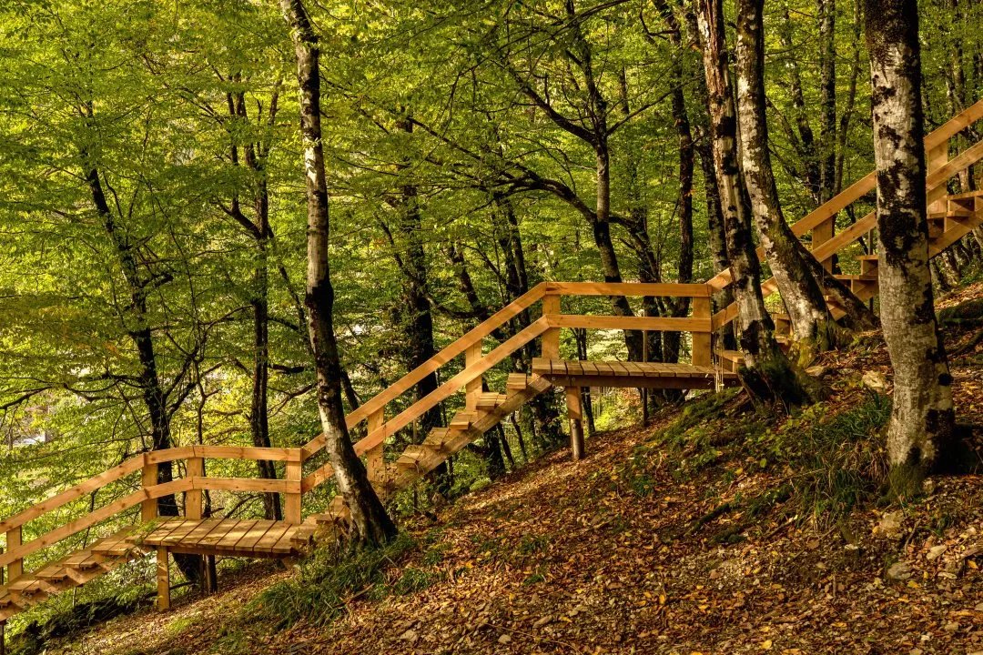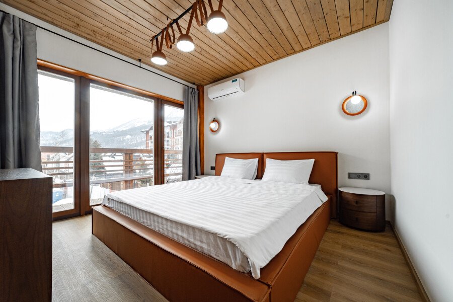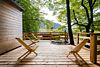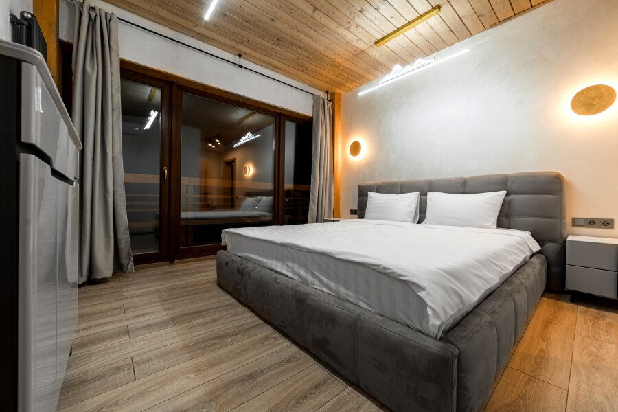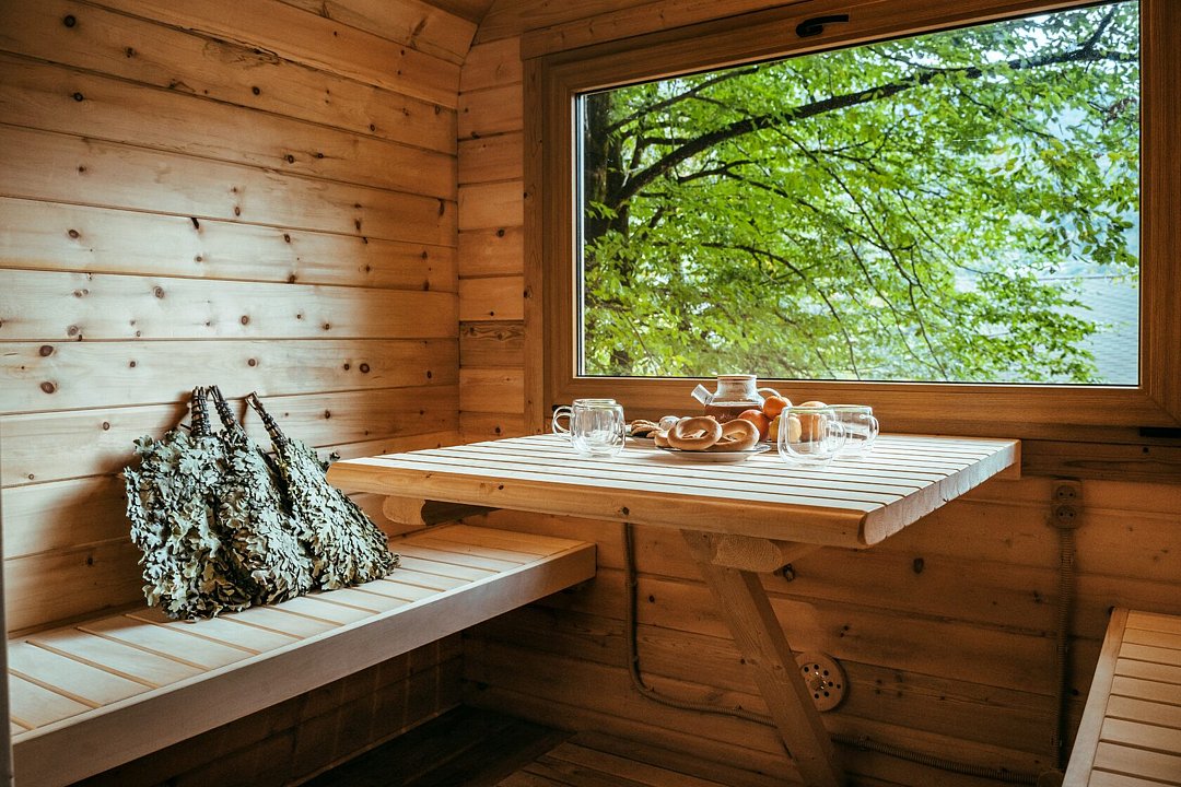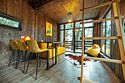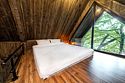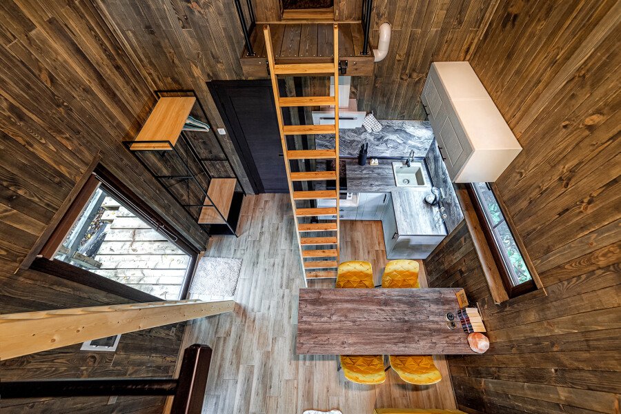 На лесном склоне ювелирно вписаны в рельеф 2 деревянных домика на деревьях по типу глэмпинга. Каждый дом таит в себе множество сюрпризов. Из окон открывается потрясающий вид на пышный лес, через кроны деревьев проглядывают снежные горы. Интерьер в стиле горной хижины дополнен различными приятными мелочами. Домики прекрасно оборудованы мебелью, кухней и необходимой техникой для комфортного пребывания.