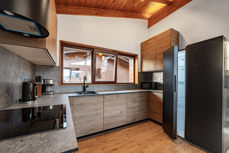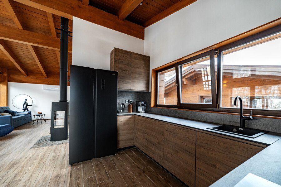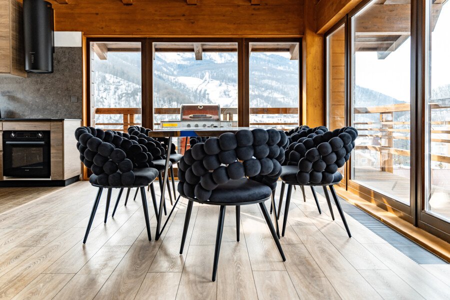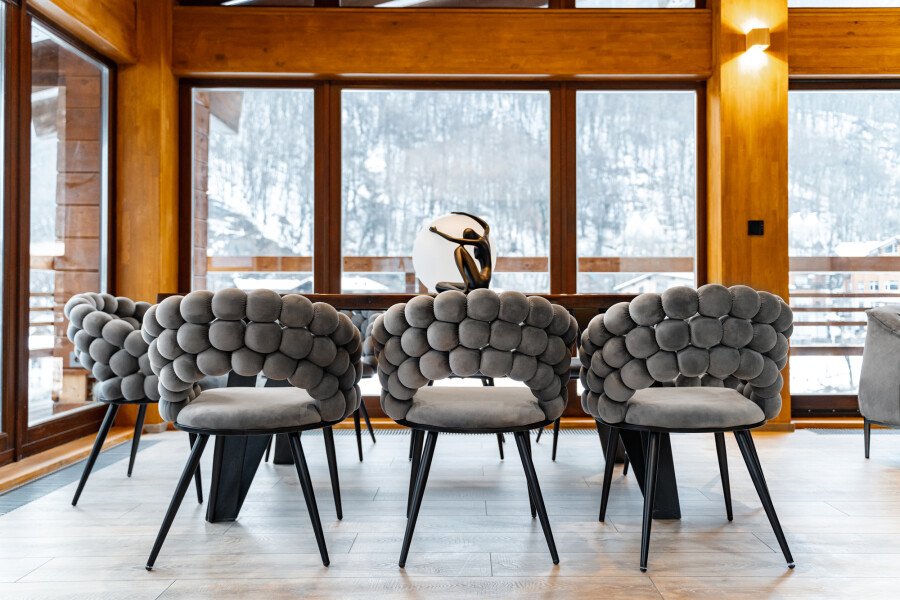 На территории расположены три коттеджа-шале большой площади, каждый из которых состоит из гостиной, трех спален и четырех санузлов. В оснащении шале все продумано до мелочей, необходимая мягкая, спальная, кухонная мебель и большое количество бытовой, кухонной, климатической техники для максимального комфорта, включая длительное пребывание.