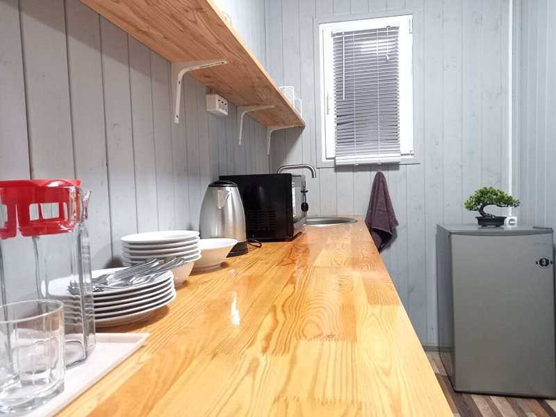 Звукоизолированный домик с двумя выделенными спальнями (две двуспальные кровати или одна двуспальная и две односпальные кровати). Оснащен электрическим чайником,микроволновой печью, мини холодильником,телевизором,кондиционером.
