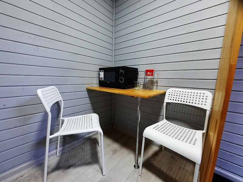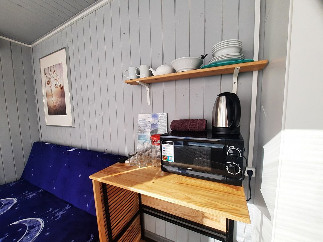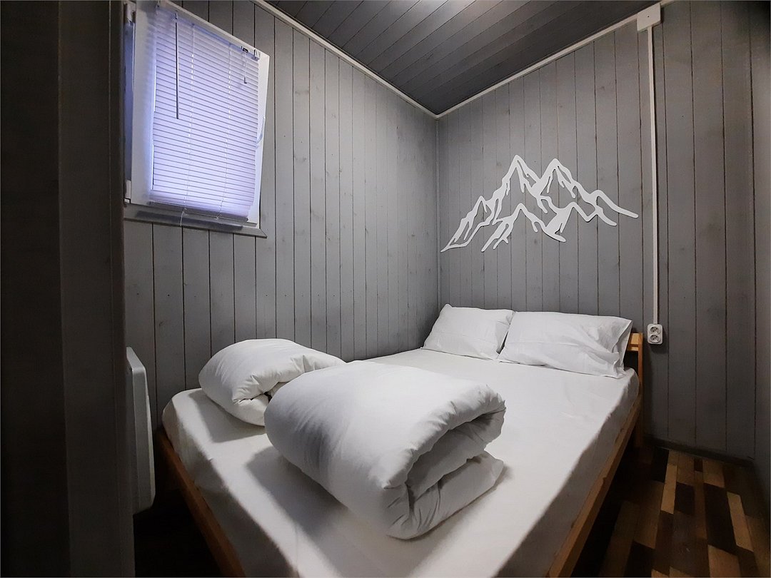 Звукоизолированный домик с одной двуспальной кроватью. Оснащен электрическим чайником, микроволновой печью, мини холодильником, телевизором