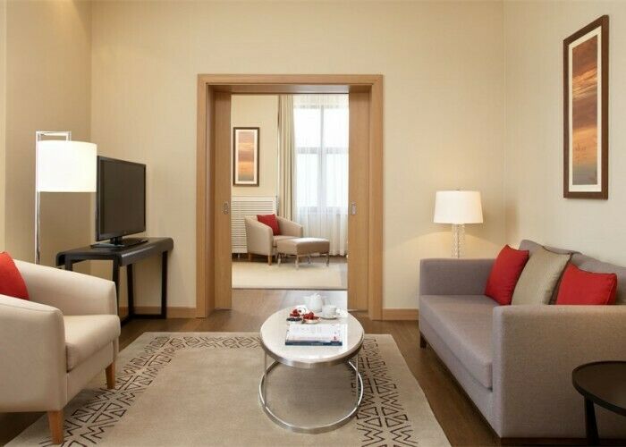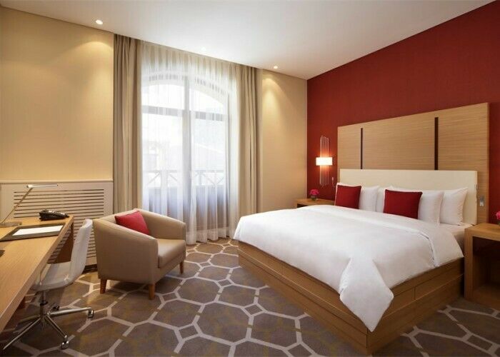 Размещение в отеле предлагается в 120-ти номерах, которые придутся по вкусу ценителям простора и комфорта. Интерьеры выполнены в тепло-бежевых тонах с добавлением ярких декоративных элементов. Современный стиль номеров характеризуют правильные геометрические формы, много света и никаких лишних деталей. Отдельного внимания заслуживает ванная комната, облицованная мрамором и оборудованная душевой кабиной с функцией “тропический ливень”, а также подогревом пола. Гостям предоставляются косметические средства премиум-класса.