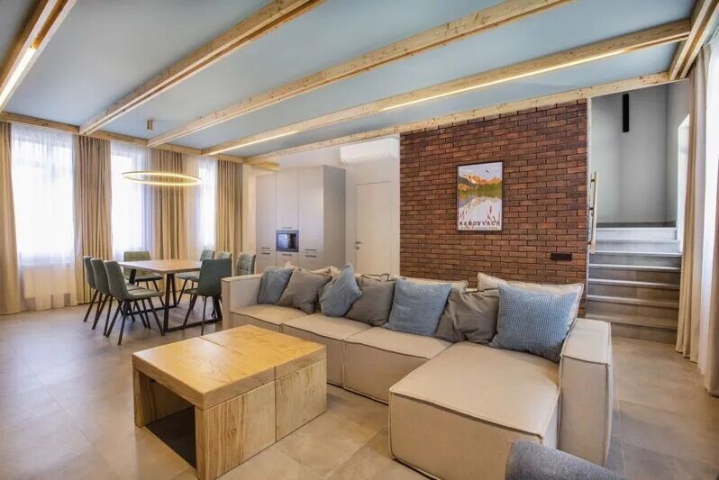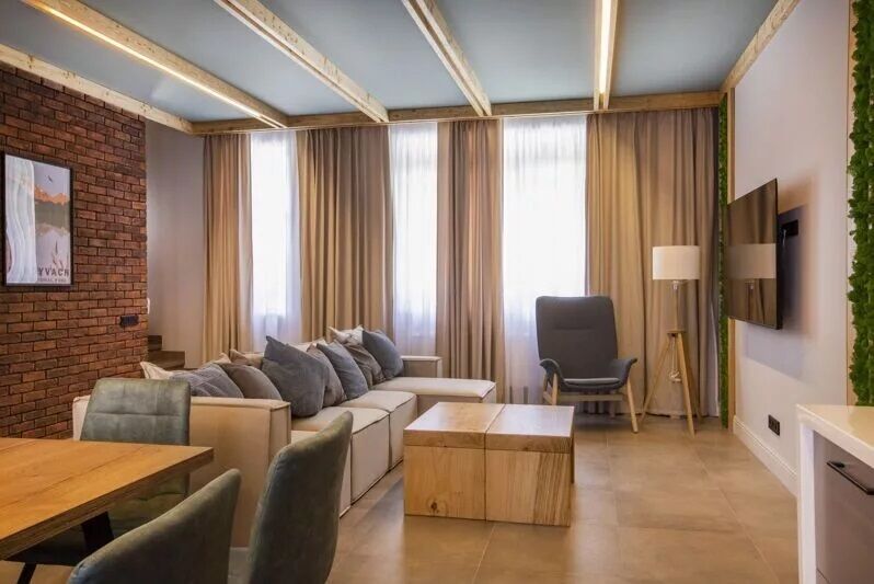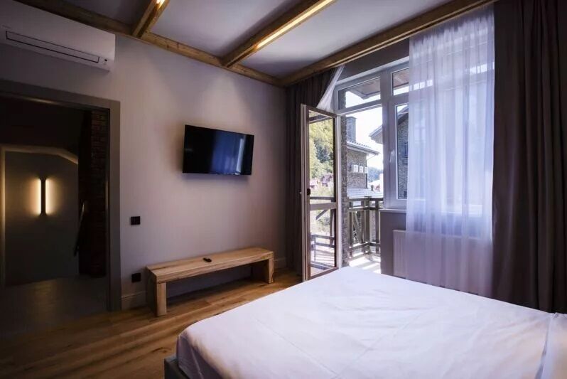 Дома выполнены в альпийском стиле не только архитектурно. Из окон открывается роскошный панорамный вид на горы, дающий умиротворение и удовольствие от уединения.