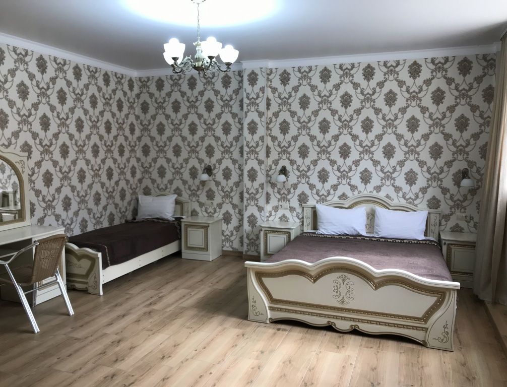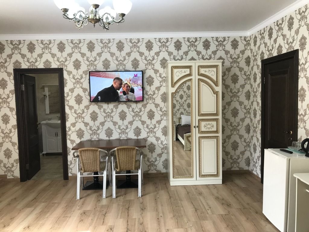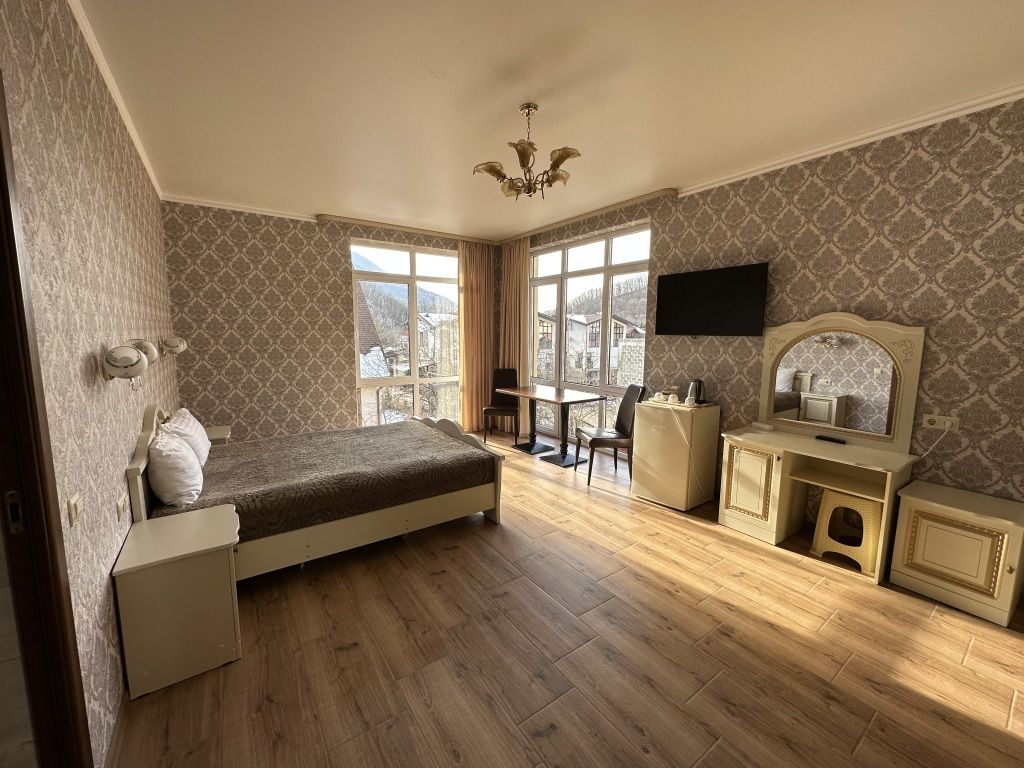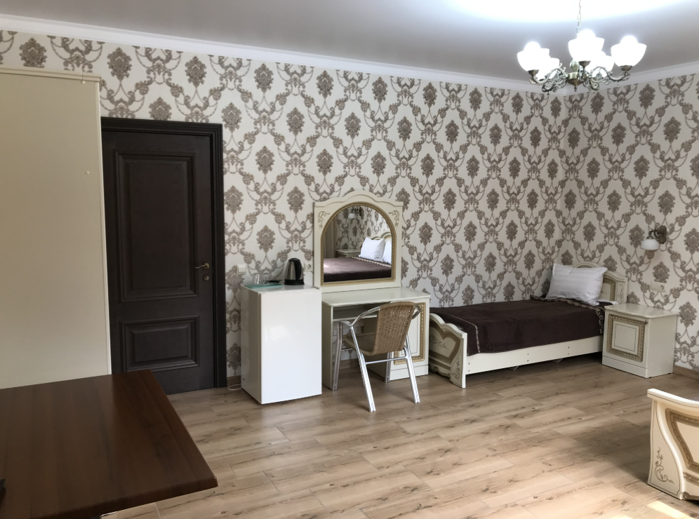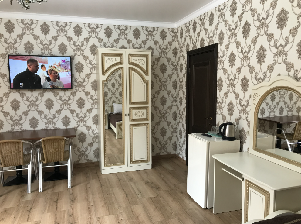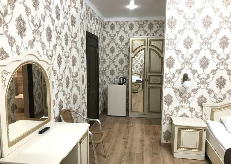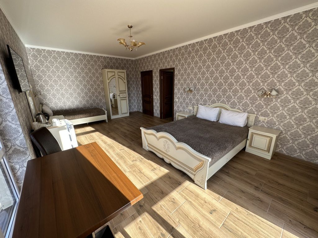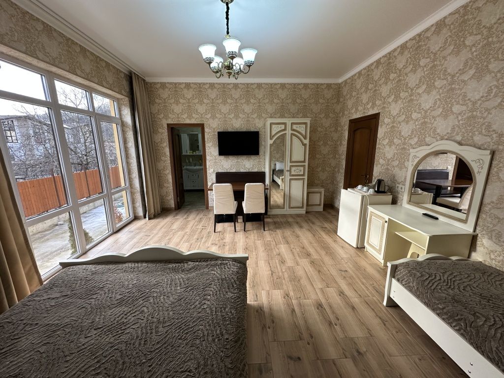 В номере: двуспальная кровать и односпальная кровать, шкаф для одежды, прикроватные тумбочки, туалетный столик с зеркалом, обеденный стол со стульями, телевизор, холодильник, электрический чайник, Wi-Fi, москитная сетка. В ванной: туалет, раковина, ванна, зеркало, набор полотенец, фен, туалетные средства, тапочки.
