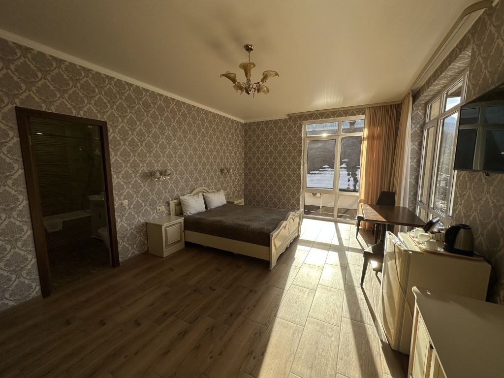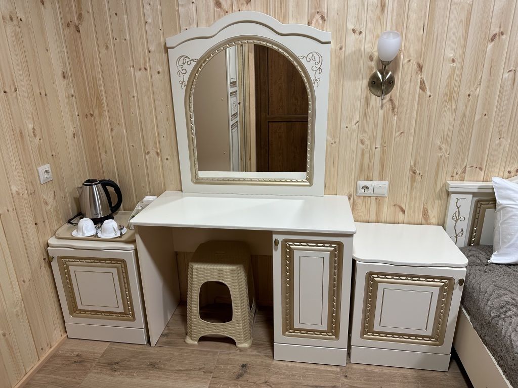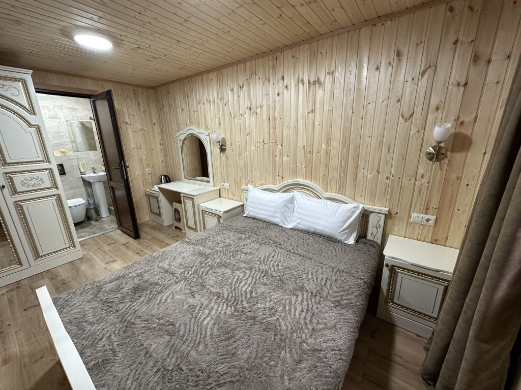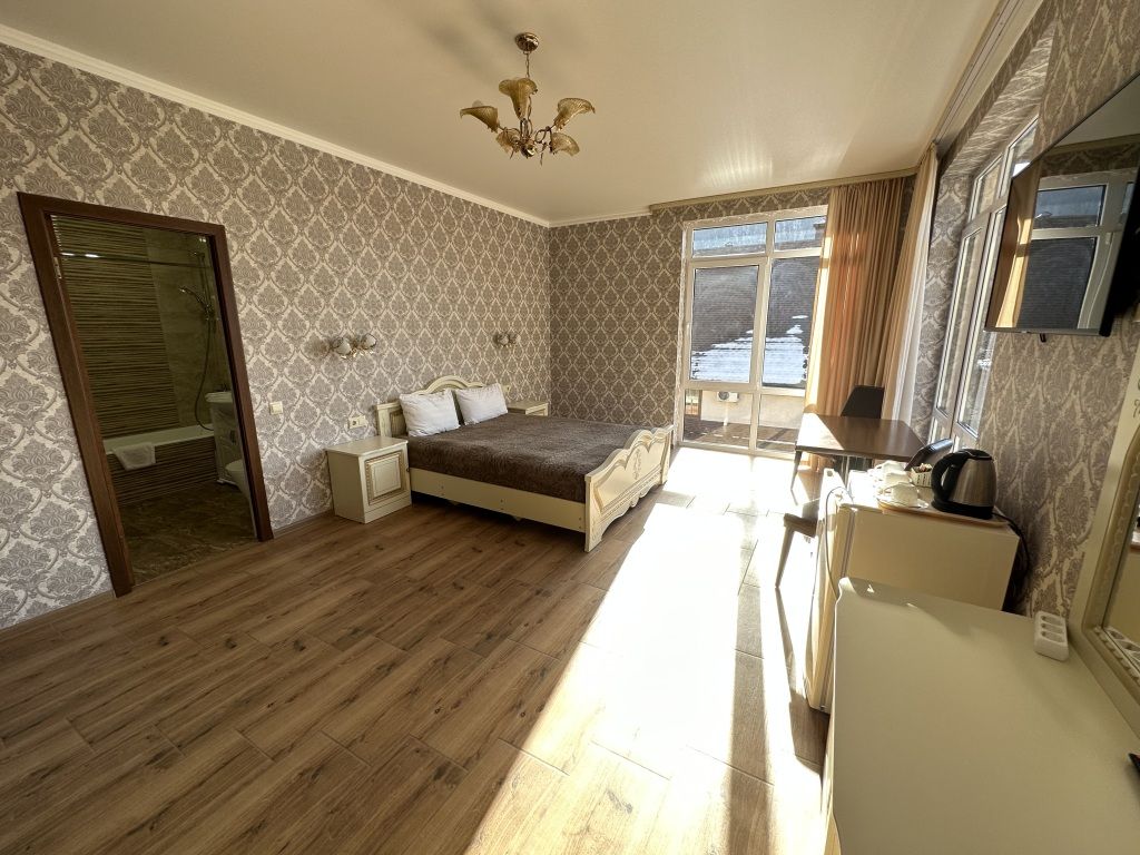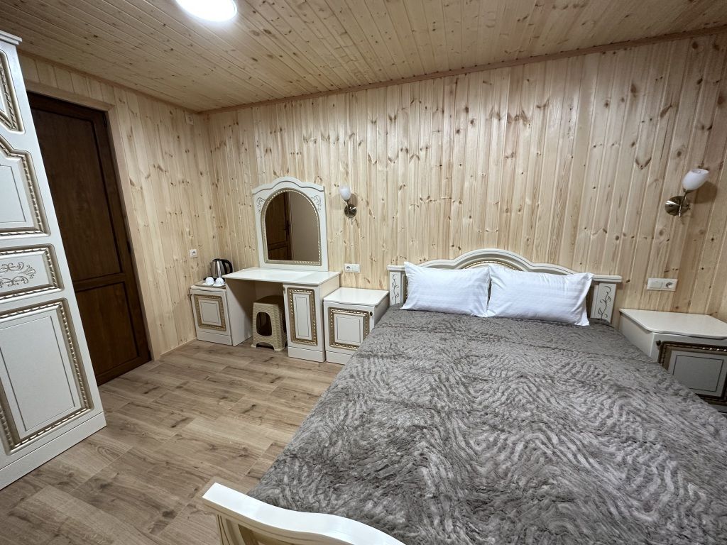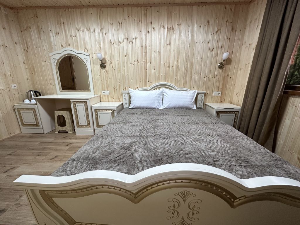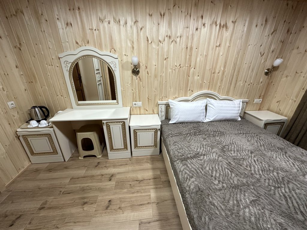 В номере: двуспальная кровать, шкаф для одежды, прикроватные тумбочки, туалетный столик с зеркалом, телевизор, холодильник, электрический чайник, Wi-Fi. В ванной: туалет, раковина, ванна, зеркало, набор полотенец, фен, туалетные средства, тапочки.