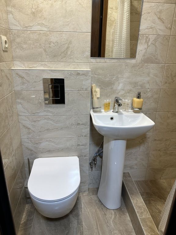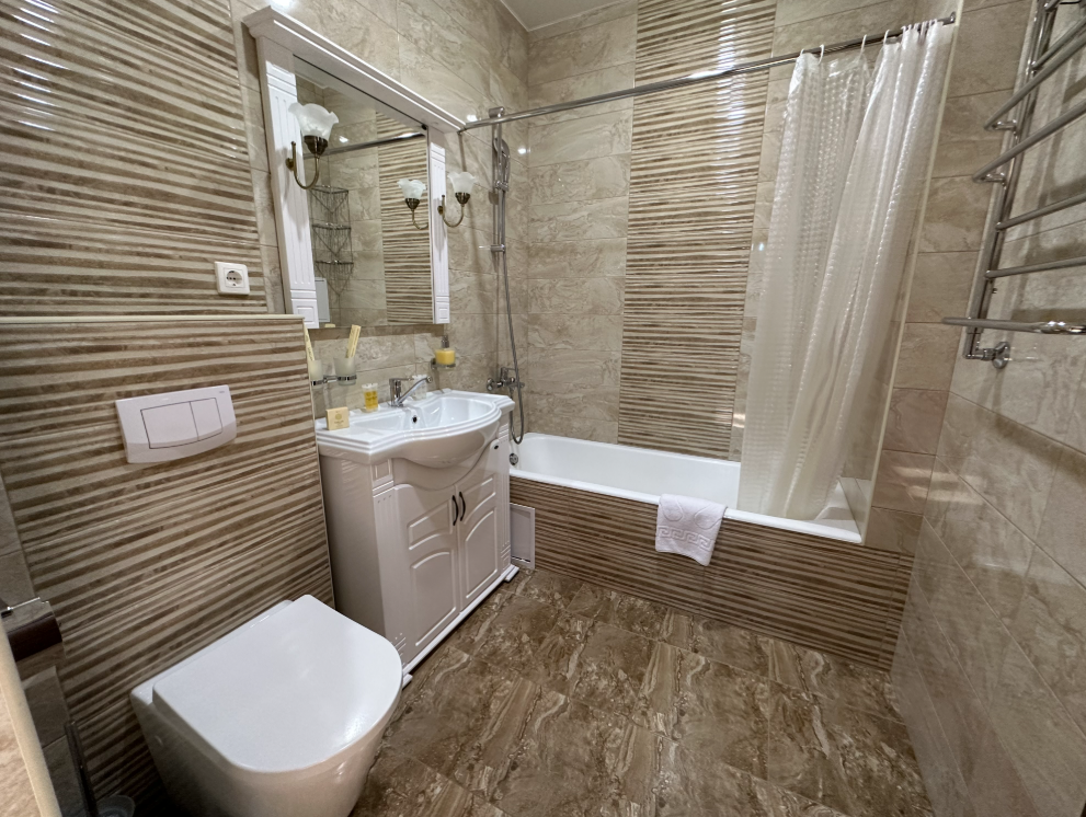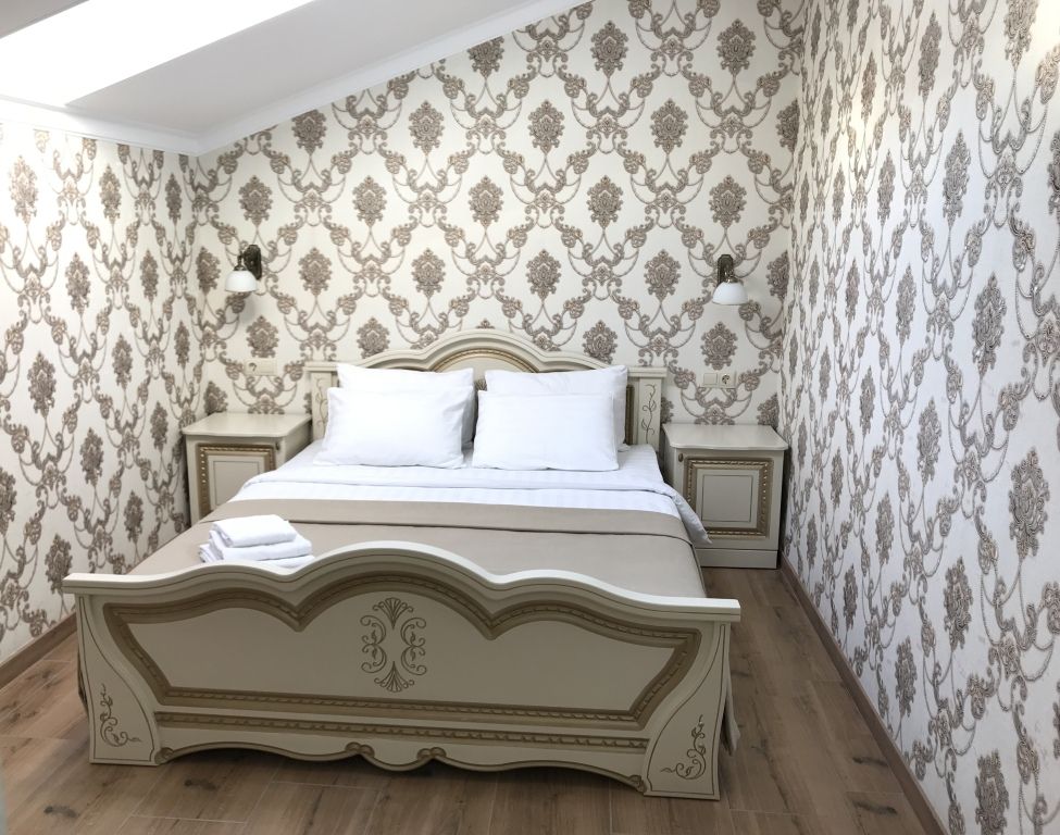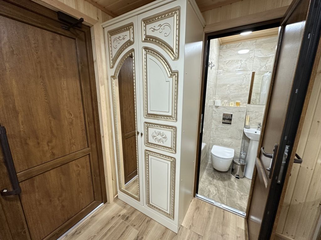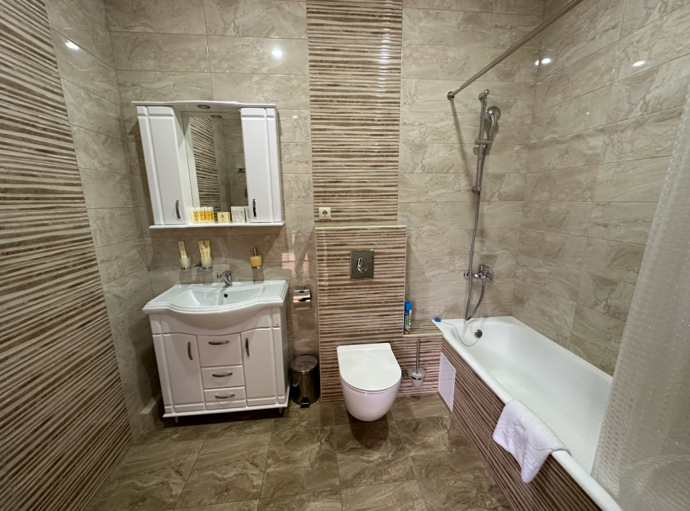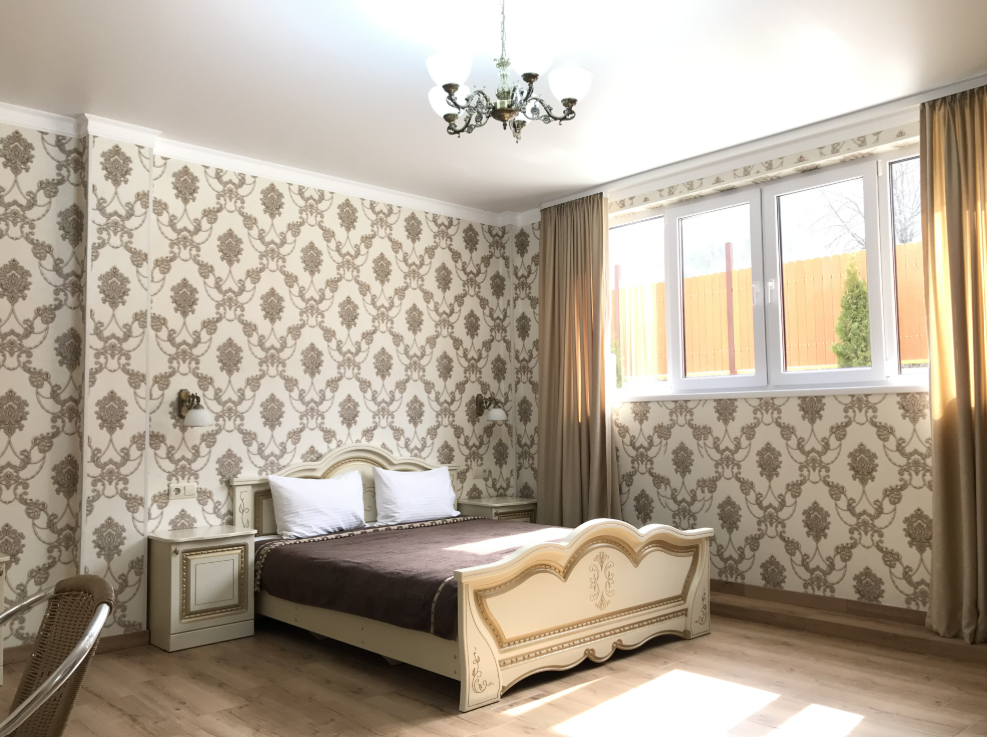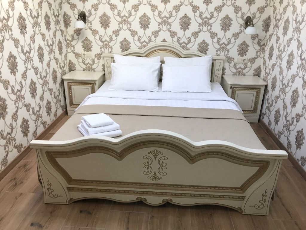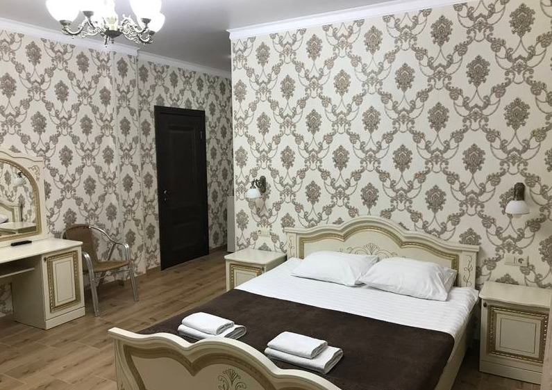В номере: двуспальная кровать, шкаф для одежды, прикроватные тумбочки, туалетный столик с зеркалом, телевизор, холодильник, электрический чайник, Wi-Fi. В ванной: туалет, раковина, ванна, зеркало, набор полотенец, фен, туалетные средства, тапочки.