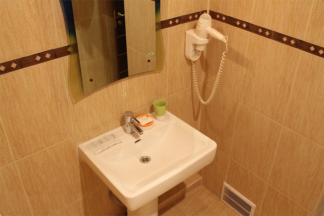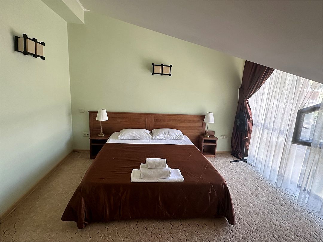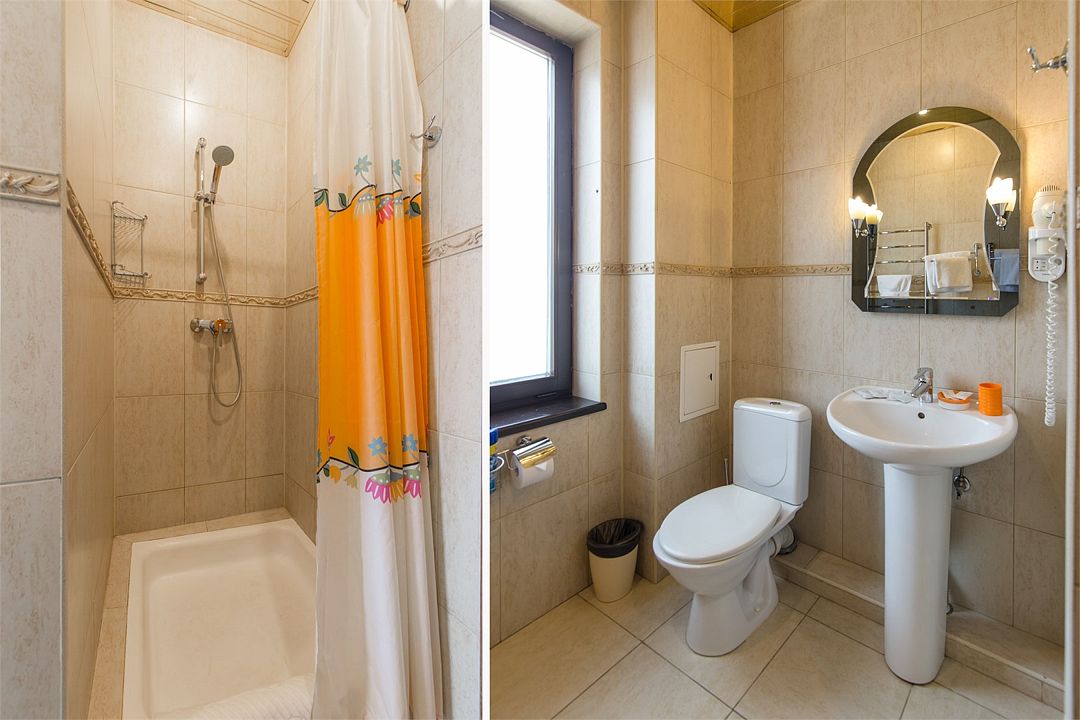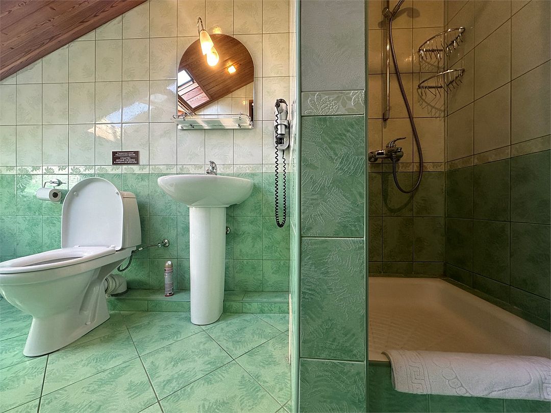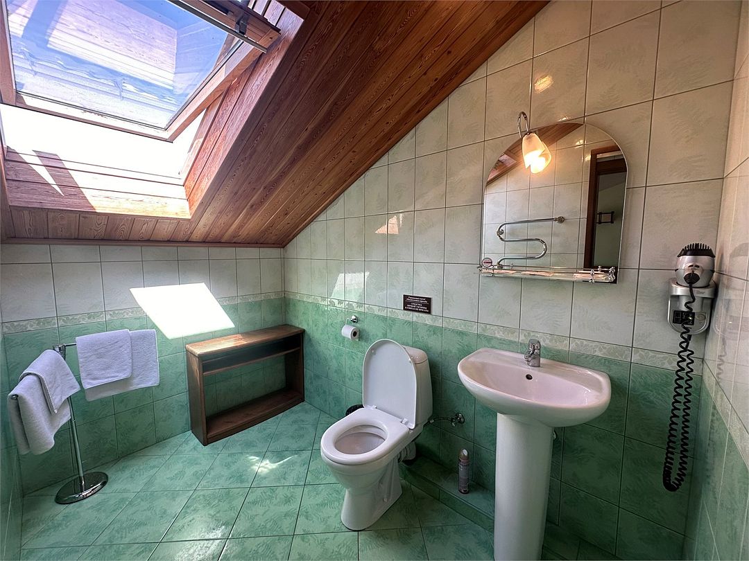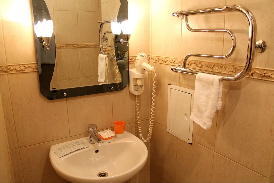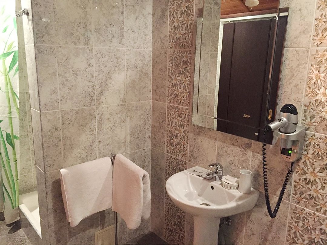 Санузел: душ, фен, средства личной гигиены, набор полотенец. Сервис: уборка номера и смена полотенец — один раз в три дня, смена белья — один раз в пять дней.