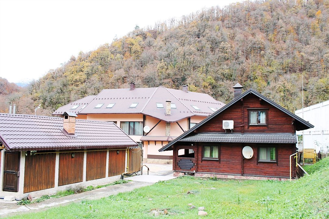 Трехэтажное здание, стилизованное под швейцарское шале, располагается на левом берегу Мзымты вблизи от главной улицы курорта. Корпус окружен растительностью, из окон номеров и с территории открывается потрясающий вид на окрестные горы.
