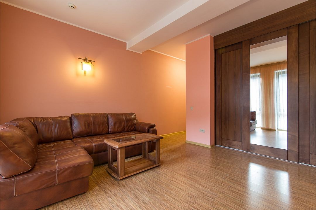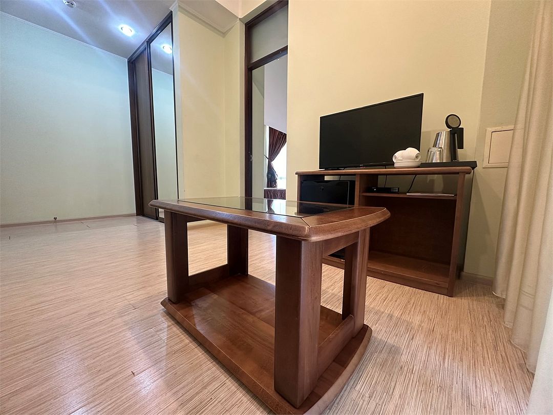 Мебель: двуспальная кровать, диван, шкаф, тумбочки, журнальный стол, зеркало, оборудование — телевизор, мини-бар, сейф, теплый пол, чайный набор (чайник и посуда для чаепития), покрытие пола — ковролин, ламинат.