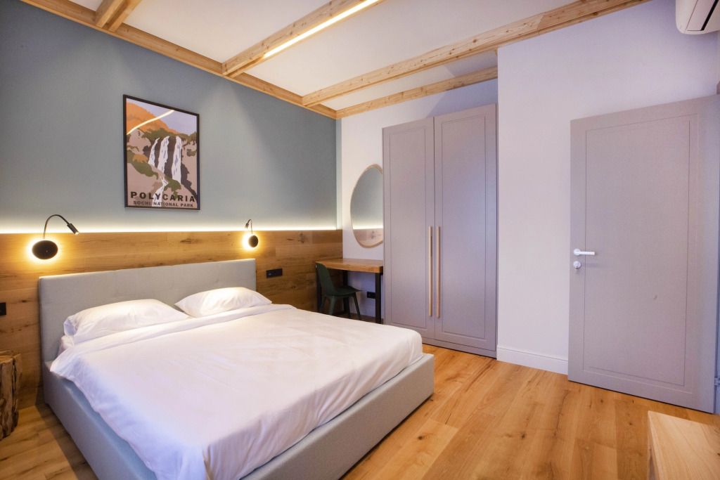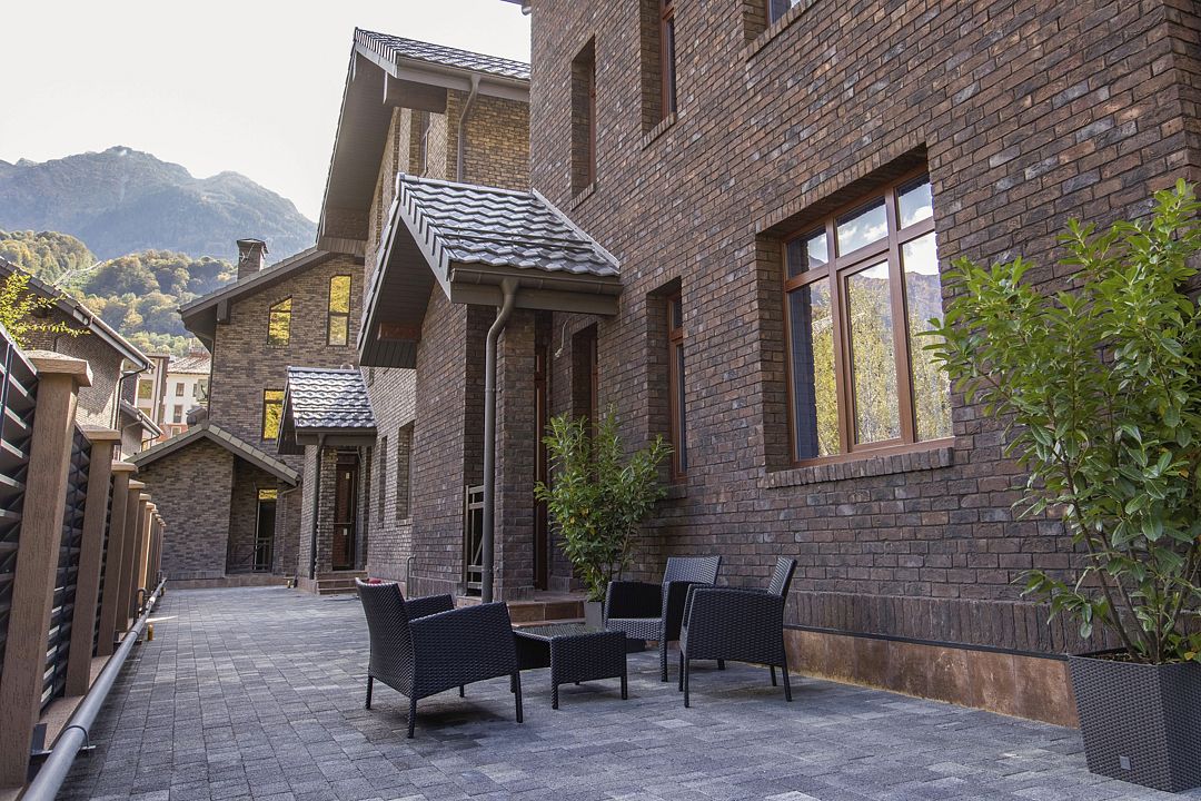 Трехэтажное шале с беседкой и bbq-зоной во внутреннем дворе, вмещает 10 основных и 2 дополнительных места. В каждом шале находятся 5 уютных спален с двуспальными кроватями, по желанию гостей в спальнях могут быть размещены детские кровати. Тишину и комфорт обеспечивают высокотехнологичные стеклопакеты и шторы блэкаут, кондиционеры создают комфортный климат в любое время года. Для всех гостей предоставляются гигиенические наборы, полотенца, халаты, тапочки. Ежедневная уборка шале с заменой белья и полотенец избавит гостей от бытовых хлопот. На первом этаже расположена гостиная комната с кухней, гардероб с принадлежностями для глажки, место для хранение лыжного инвентаря, сейф, стиральная машина, туалетная комната, выход в индивидуальную зону отдыха во внутреннем дворике и барбекю. На втором этаже спальная с выходом на балкон, вторая спальная с собственной ванной комнатой, душевая комната с туалетом на этаже. Третий этаж имеет три спальные комнаты с одной большой кроватью (одна комната с балконом), душ и туалетная комната на этаже. Все спальные комнаты оснащены одной большой кроватью, просторными шкафами, ТВ, кондиционером. Панорамный вид из каждого шале на Кавказские хребты, красота первозданной природы, минутная доступность до всех культурно-развлекательных мест курорта и высококлассный сервис сделает Ваш отдых ярким и незабываемыми.Услуги и удобства