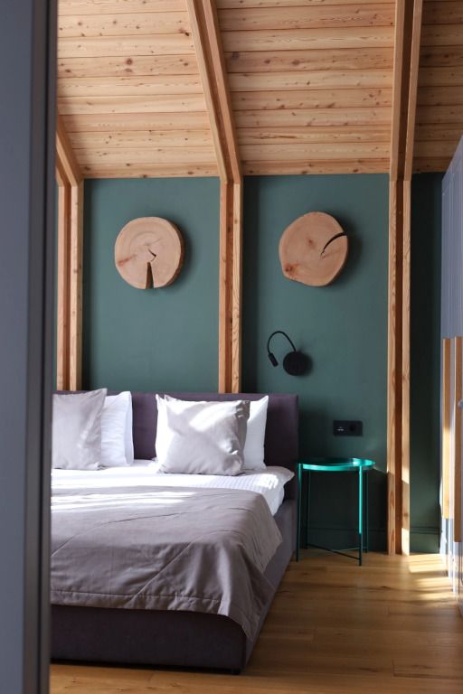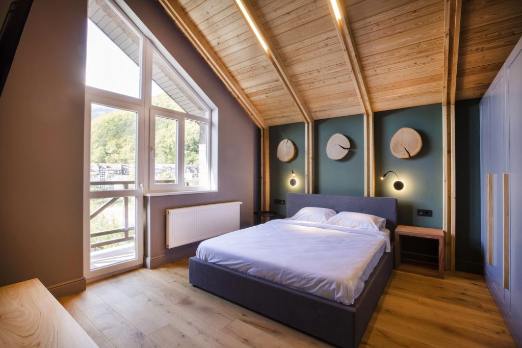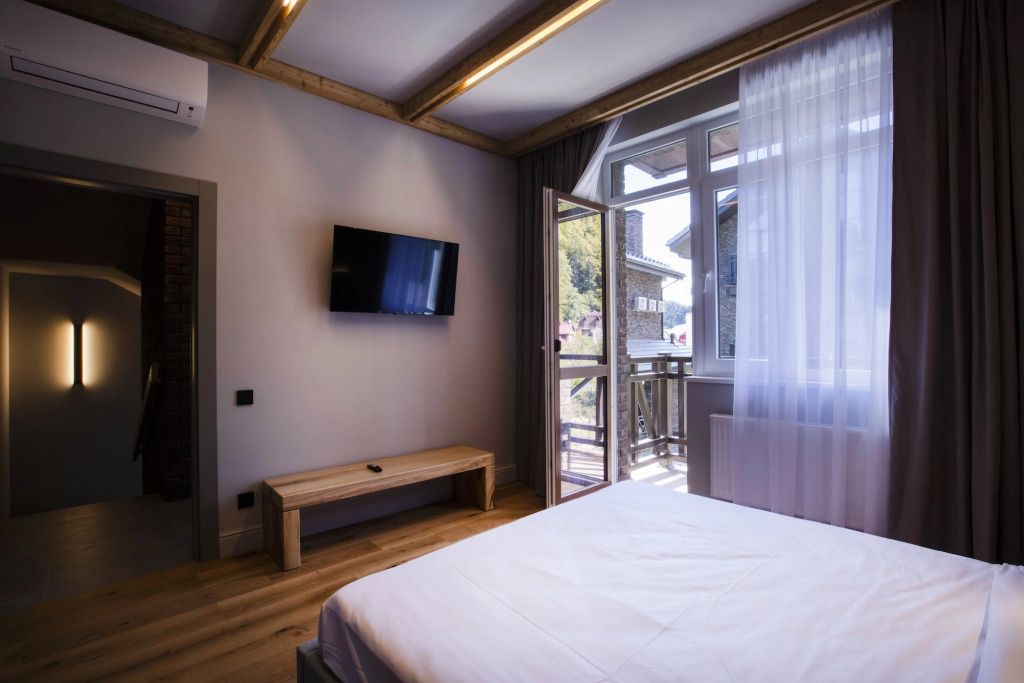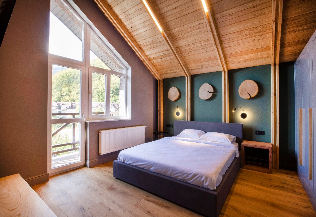 Шале оснащены современными стеклопакетами и шторами блэкаут, а также кондиционерами.