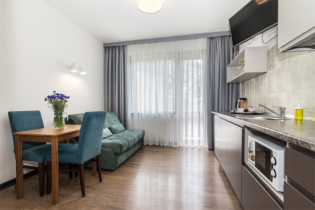 телевизор, Wi-Fi, холодильник, кондиционер, светильник, фен, микроволновая печь, душевая кабина, банные полотенца, балкон, балкон с красивым видом, две односпальные или большая двуспальная кровать, диван, тумбы, стулья, шкаф для одежды, обеденный стол, зеркало, кухня, чайный набор, набор посуды, чайник, унитаз, раковина, питьевая вода, обеденная зона, душ, вид на сад, кулер на этаже, вид во двор, кухонная посуда, стаканы, кухонная утварь, столовые приборы, туалетные средства, туалет, сплит-система, диван-кровать, раскладной диван, телевизор с плоским экраном, мини-кухня, теплые полы, номер для некурящих, вид на бассейн, общественный бассейн, уборка номера, набор для приготовления чая и кофе, услуги прачечной (платно), вешалки-плечики, без питомцевВ аппартаментах