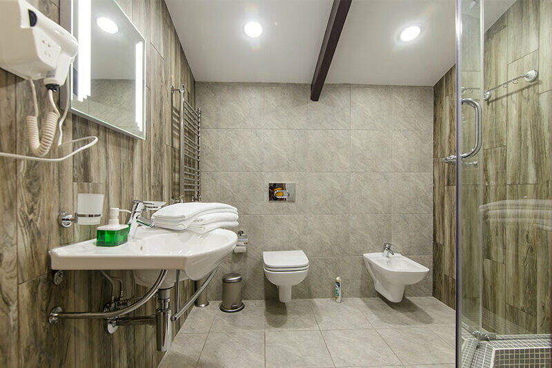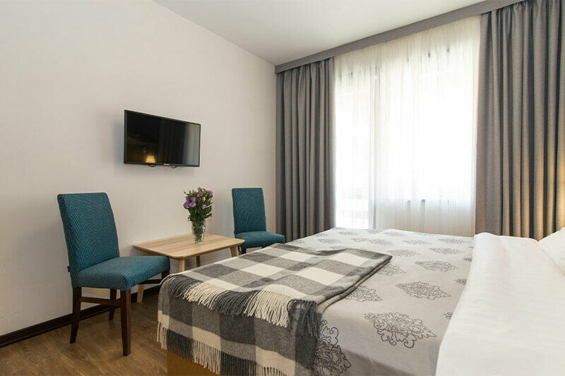 Wi-Fi, кондиционер, фен, теплый пол, банные полотенца, балкон, две односпальные или большая двуспальная кровать, тумбы, стулья, шкаф для одежды, журнальный столик, зеркало, чайный набор, унитаз, раковина, питьевая вода, душ, вид на город, кулер на этаже, ламинат, стаканы, кофейный столик, туалетные средства, цифровое тв, телевизор с плоским экраном, мини-холодильник, шкаф-купе, номер для некурящих, общественный бассейн, уборка номера, набор для приготовления чая и кофе, услуги прачечной (платно), вешалки-плечики, без питомцевВ номере