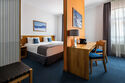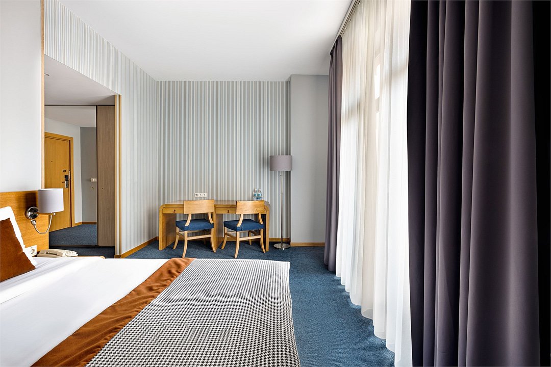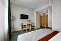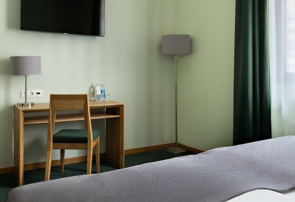 Современный номер с одной двуспальной кроватью «King-size» или двумя полутороспальными кроватями предназначен для комфортного размещения гостей. Номер укомплектован ЖК телевизором, рабочим местом, телефоном, мини-холодильником, чайником и набором посуды. Ванная комната с подогреваемым полом оборудована просторной душевой кабиной, набором полотенец, косметическими принадлежностями и феном. Номер может быть оснащен оборудованием необходимым для людей с ограниченными возможностями.Услуги и удобства