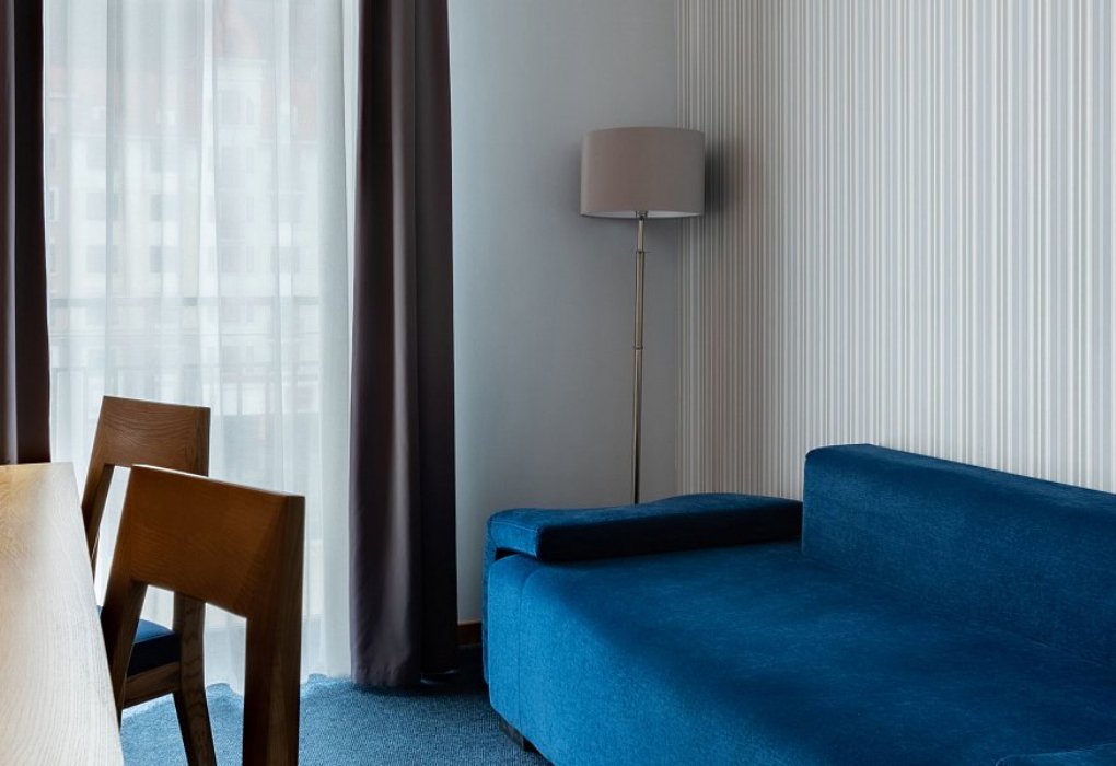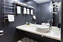 2-спальная или две 1,5-спальные кровати, раскладной диван, ТВ, рабочее место, телефон. Ванная комната с подогреваемым полом оборудована душевой кабиной, набором полотенец, косметическими принадлежностями и феном.