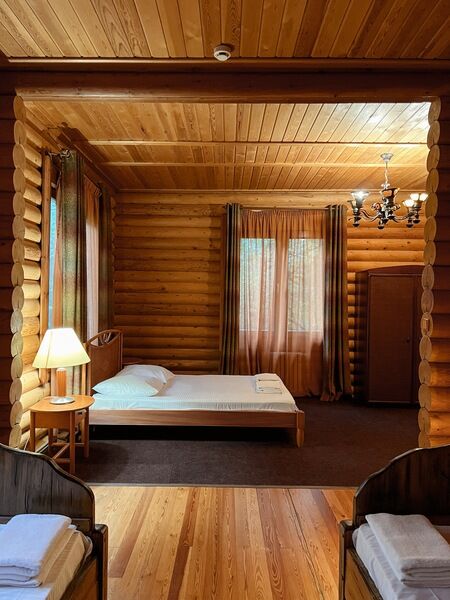 Для размещения предлагается двухэтажный деревянный дом на 5 комфортных спален