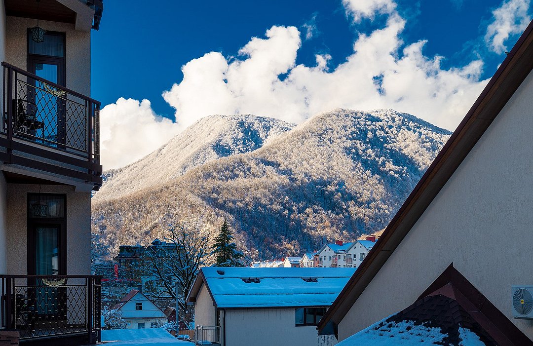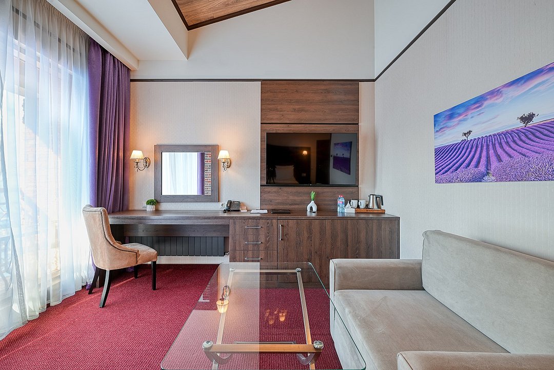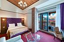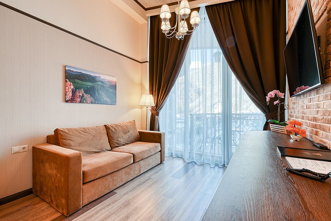 Дизайнерский номер Deluxe на двоих с балконом и видом на горы. Площадь номера составляет 26м2. Гости имеют свободный доступ к посещению SPA комплекса, уличного бассейна и тренажерного зала.Услуги и удобства
