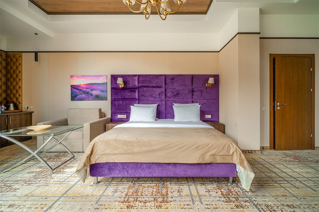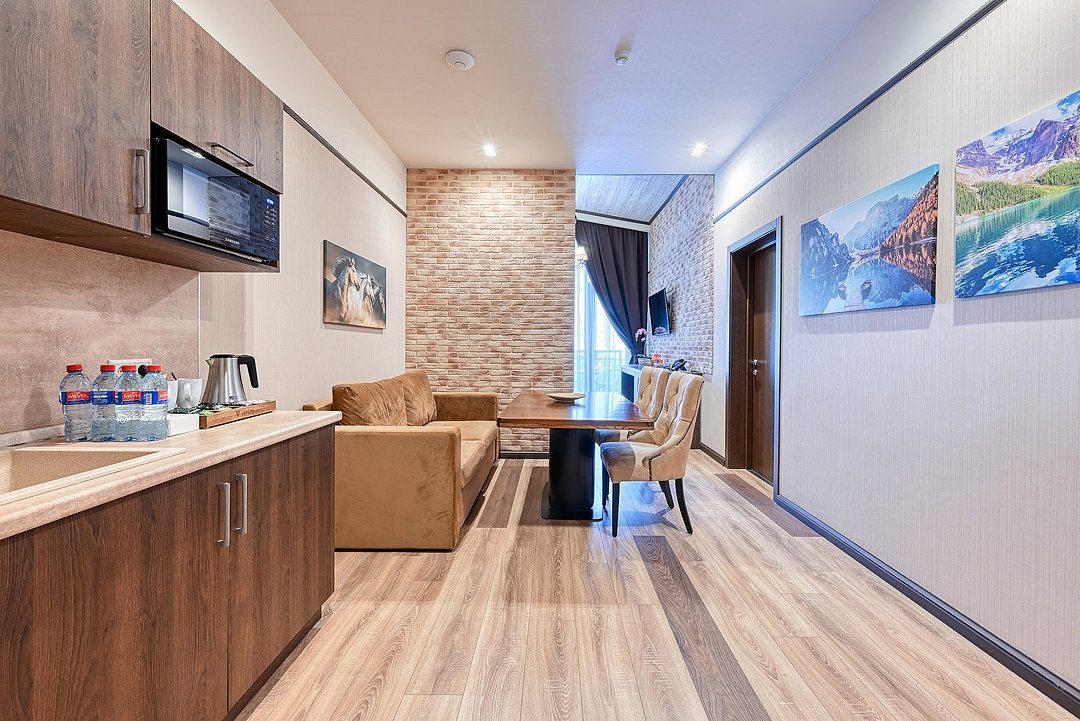 Роскошный номер Luxury создаёт идеальную атмосферу для отдыха. Оснащен двуспальной кроватью размера King size, кухней, большим ЖК телевизором, просторной ванной комнатой и балконом. Подходит для размещения гостей в количестве до 3х человек. Гости имеют свободный доступ к посещению SPA комплекса, уличного бассейна и тренажерного зала.Услуги и удобства