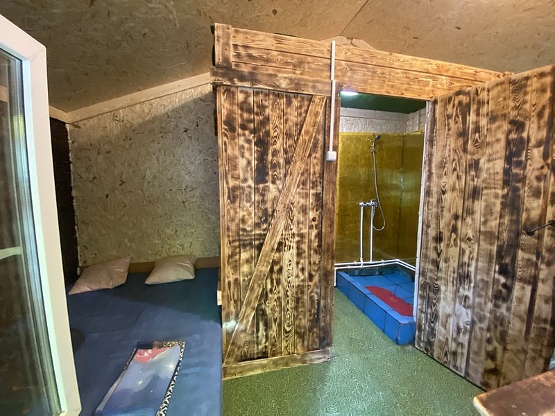 Дом со всеми удобствами в доме: двухспальная кровать, холодильник, совмещенный санузел и душ.