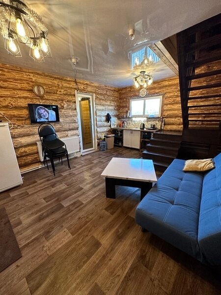 На первом этаже зал, кухонный гарнитур с обеденной зоной. На втором этаже 2 спальни.
