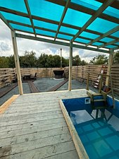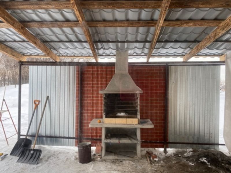 Первый этаж: просторная жилая комната с кухней, гостиной и 2 санузлами. Есть выход на мангальную зону.