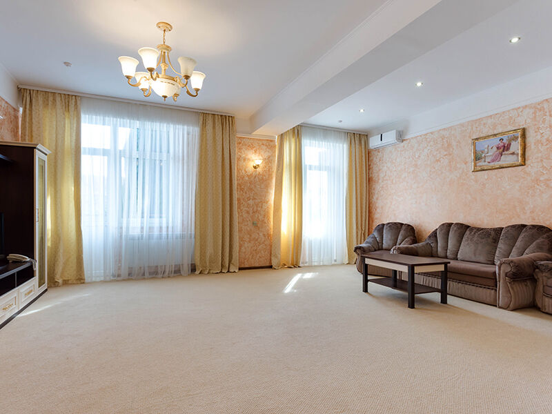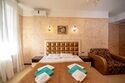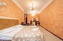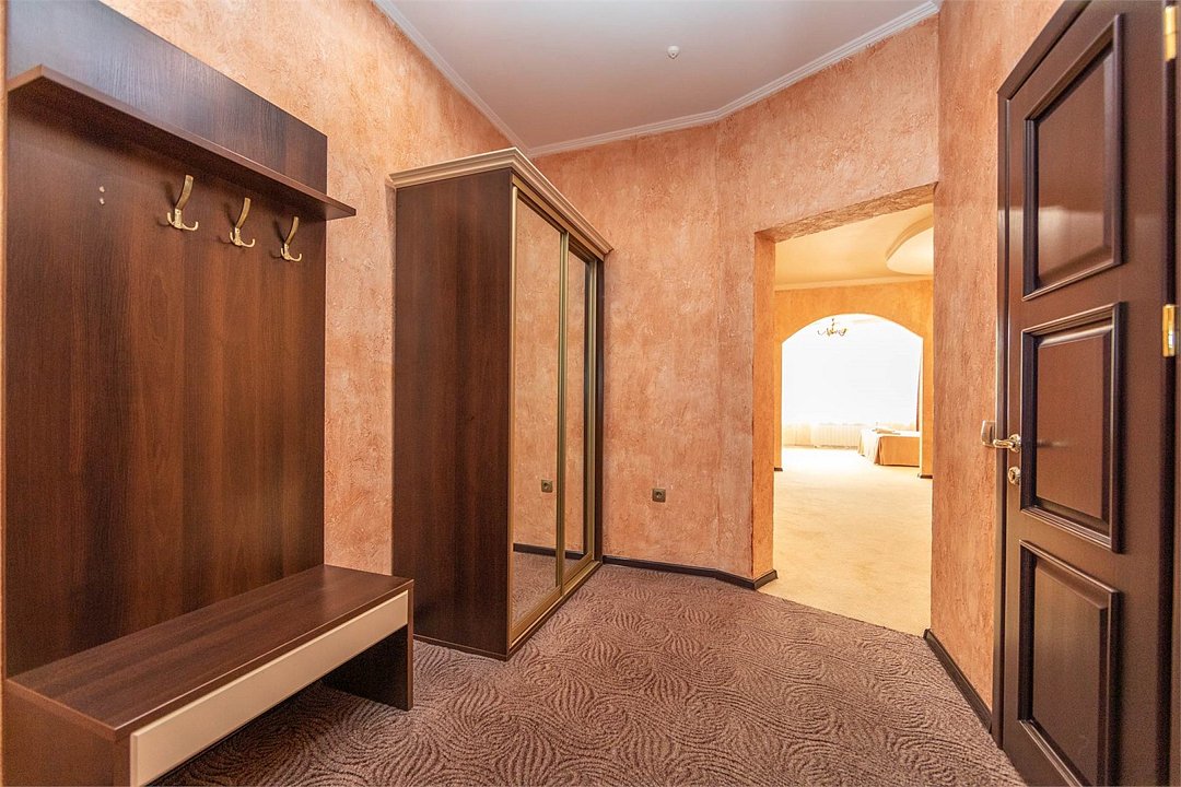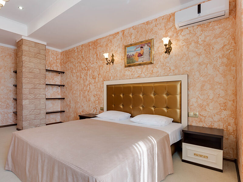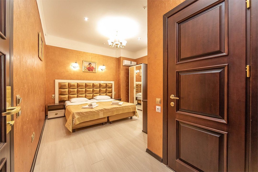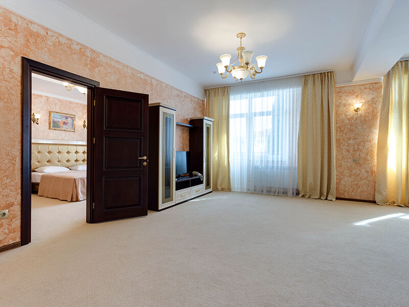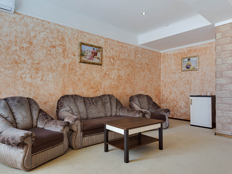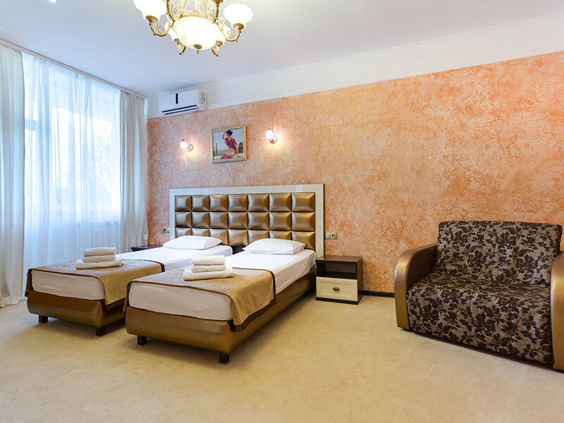 Двухкомнатный номер с балконом, площадь 60 м2. Две комнаты разделены межкомнатной дверью. В номере: прихожая, одёжный шкаф, двуспальная кровать, журнальный столик, туалетный столик с зеркалом, кресла, диван, прикроватные тумбочки, Wi-Fi, кондиционер, холодильник, телевизор, сейф. В качестве дополнительных мест предоставляется два раскладывающихся кресла и двуспальный диван. При размещении с маленькими детьми, бесплатно устанавливается детская кроватка.Услуги и удобства