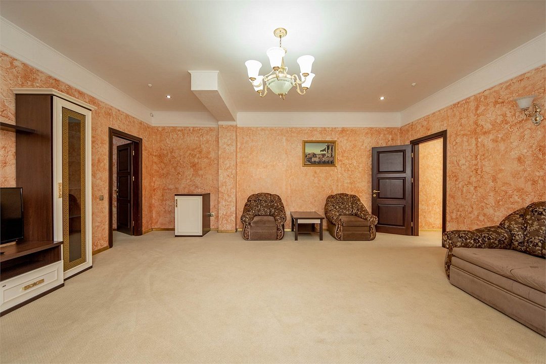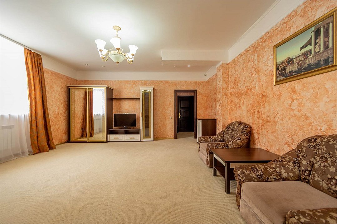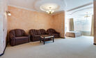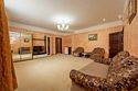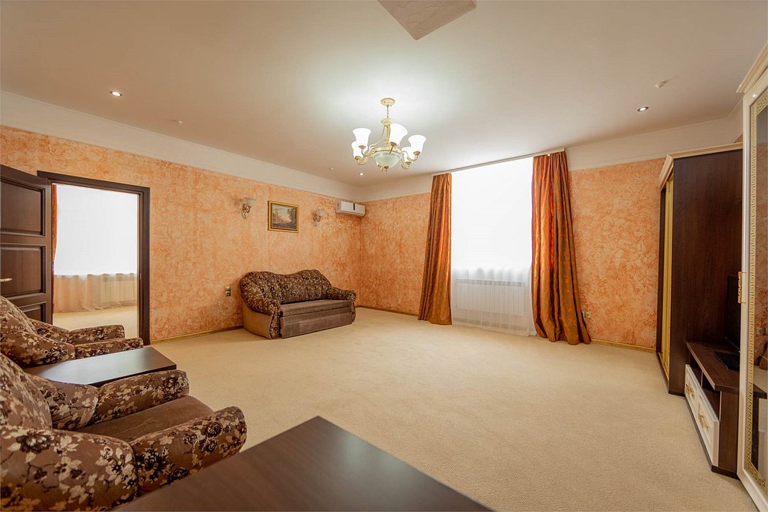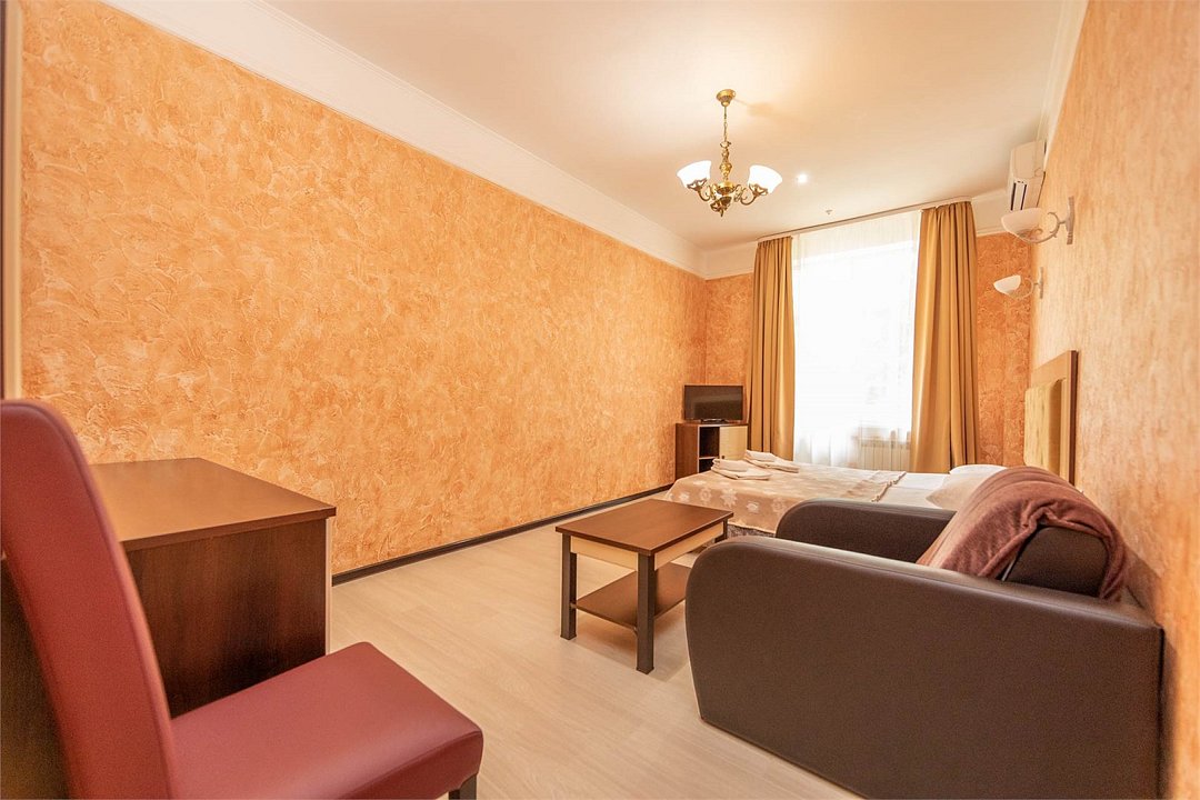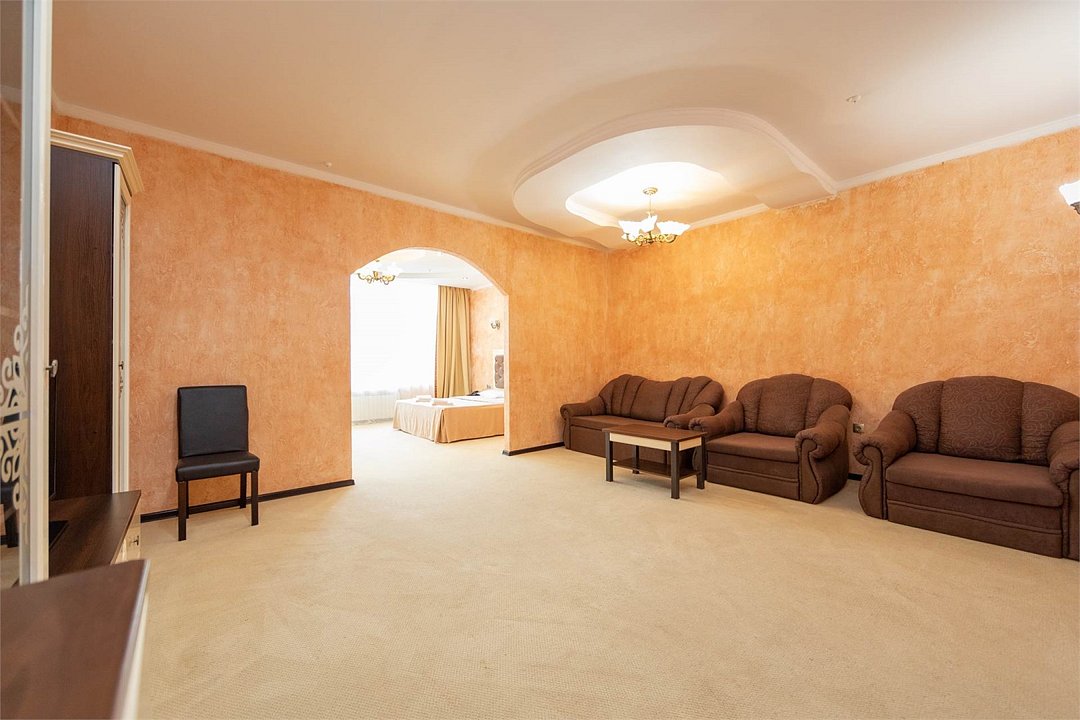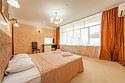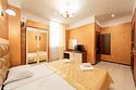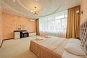 Номер с балконом, разделен перегородкой на два отдельных пространства: гостиная и спальня, общая площадь 50 м2. В номере: прихожая, одёжный шкаф, двуспальная кровать, диван, кресла, журнальный столик, туалетный столик с зеркалом, журнальный столик, прикроватные тумбочки, Wi-Fi, кондиционер, холодильник, телевизор, сейф. В качестве дополнительных мест предоставляется два раскладывающихся кресла и двуспальный диван. При размещении с маленькими детьми, бесплатно устанавливается детская кроватка.Услуги и удобства