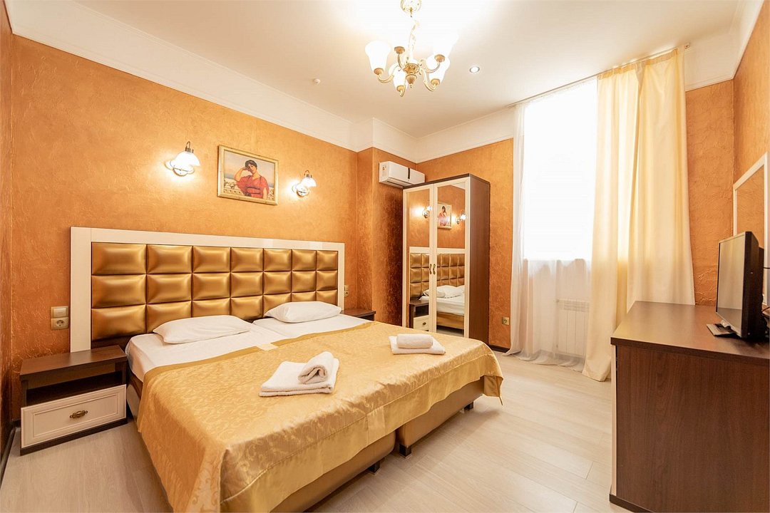 Однокомнатный номер с балконом, общая площадь от 23 до 25 м2. В номере: одёжный шкаф, две односпальные кровати с возможностью объединения, туалетный столик с зеркалом, прикроватные тумбочки, Wi-Fi, кондиционер, холодильник, телевизор, сейф. В качестве дополнительного места предоставляется кресло-кровать или еврораскладушка. При размещении с маленькими детьми, бесплатно устанавливается детская кроватка.Услуги и удобства