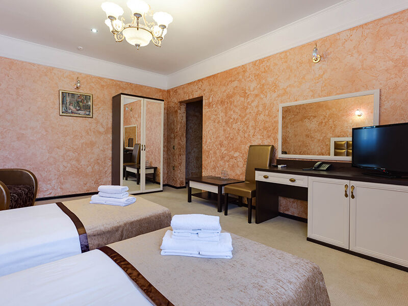 Однокомнатный двухместный номер без балкона, общая площадь 12 м2. В номере: одёжный шкаф, две односпальные кровати с возможностью объединения, туалетный столик с зеркалом, прикроватные тумбочки, шкаф, Wi-Fi, кондиционер, холодильник, телевизор. Дополнительное место не предусмотрено. При размещении с маленькими детьми, бесплатно устанавливается детская кроватка.Услуги и удобства
