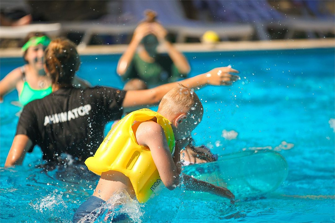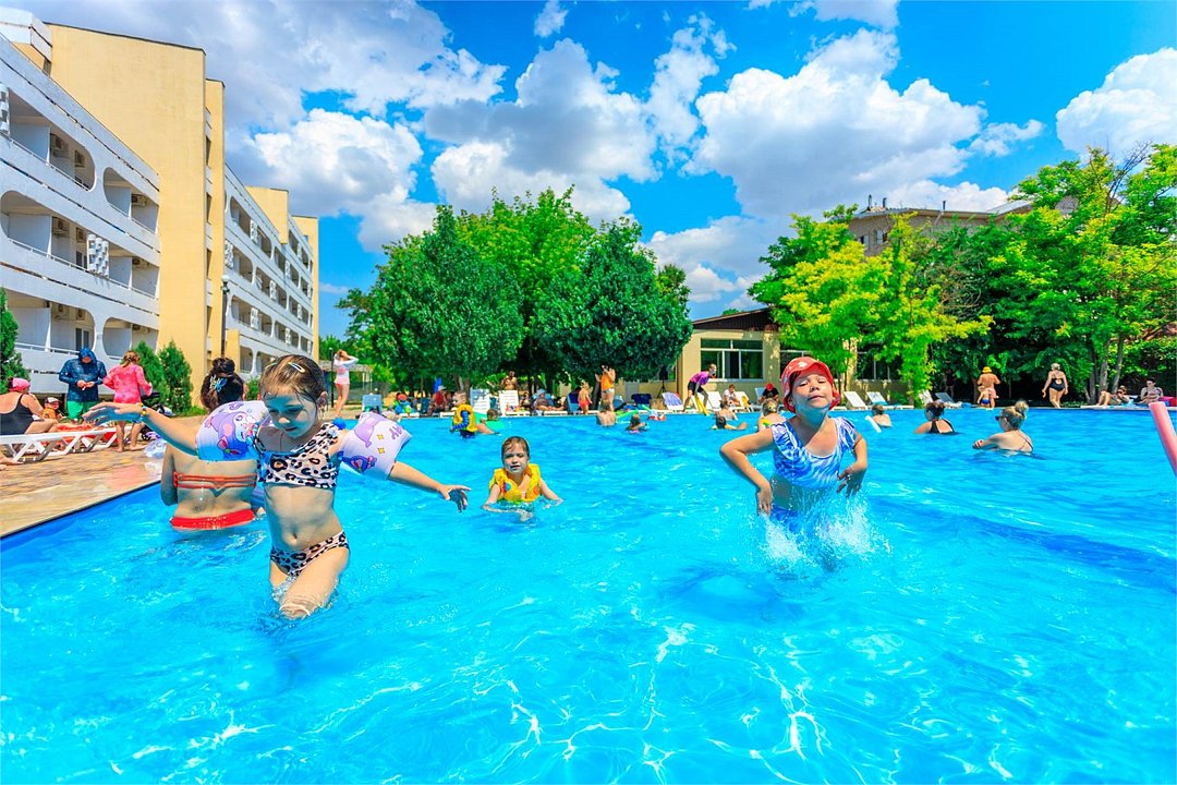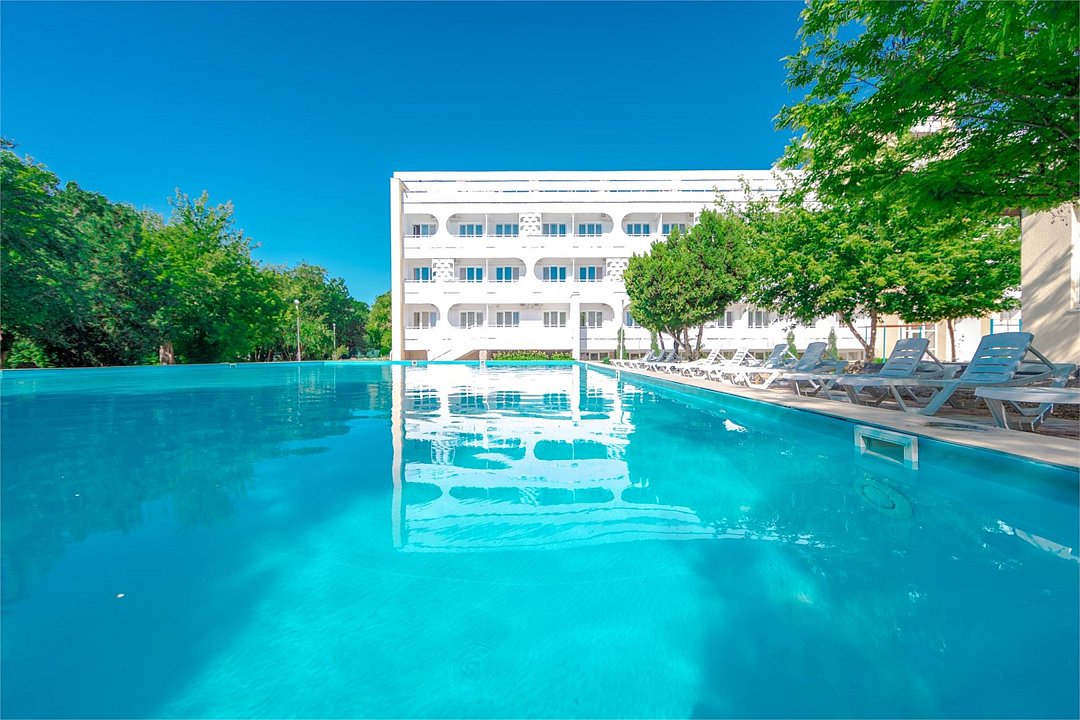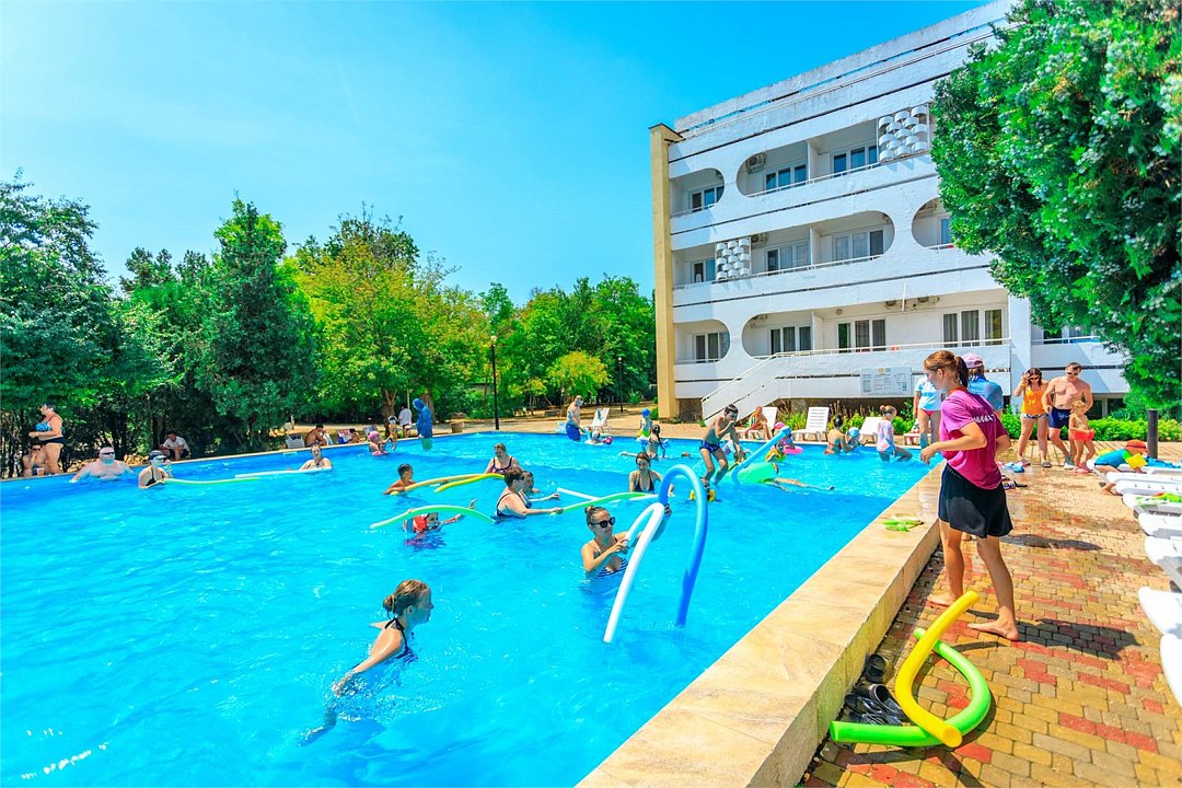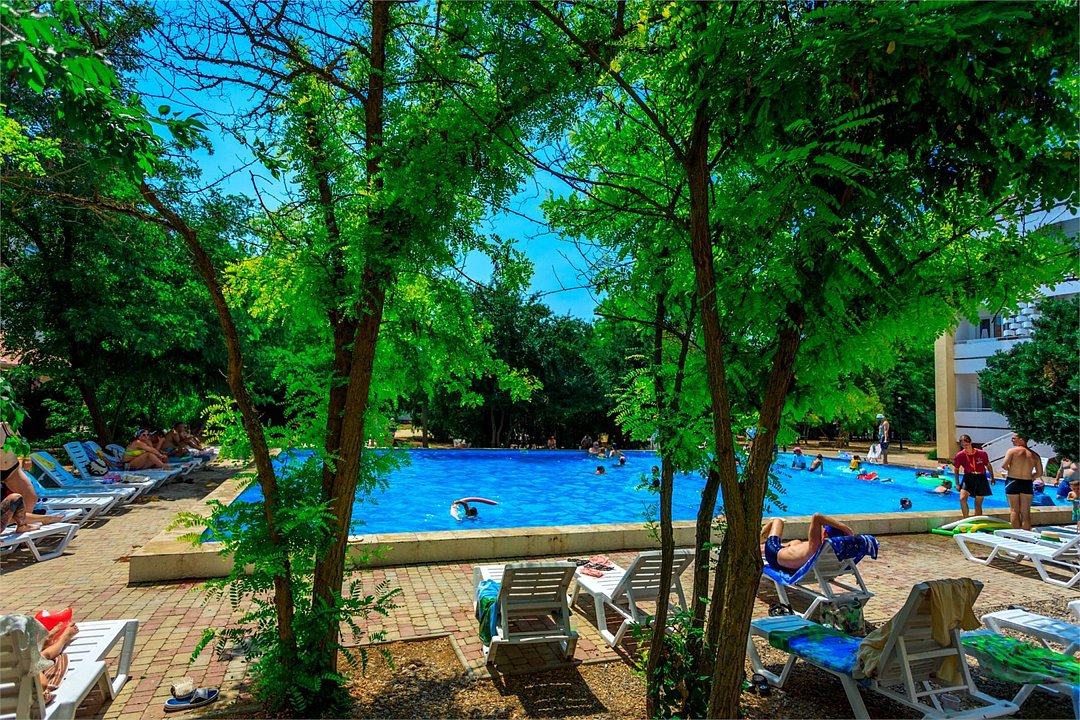 Территория небольшая, есть детская площадка, бассейн, довольно приличный, около него сидит дежурный. Есть аниматор для детей-на пляже и вечером мини-диско. Номер обычный, по социальной путёвке везде такие. Белье меняли раз в 10 дней, но если нужно поменять полотенце или простынь- без проблем. Уборка через день, мусор выносят ежедневно.