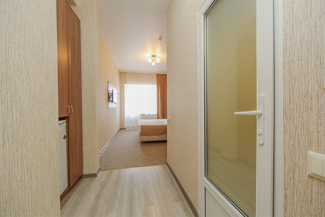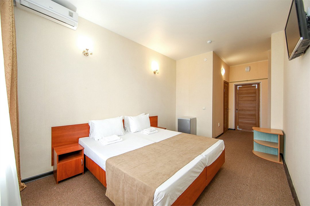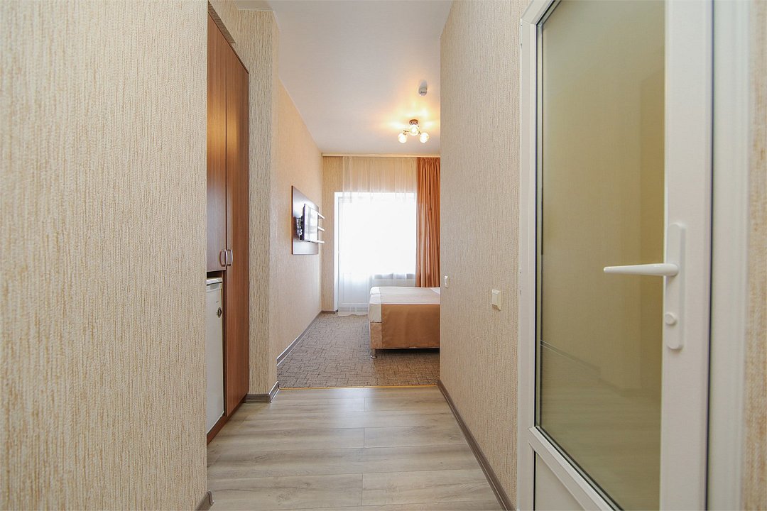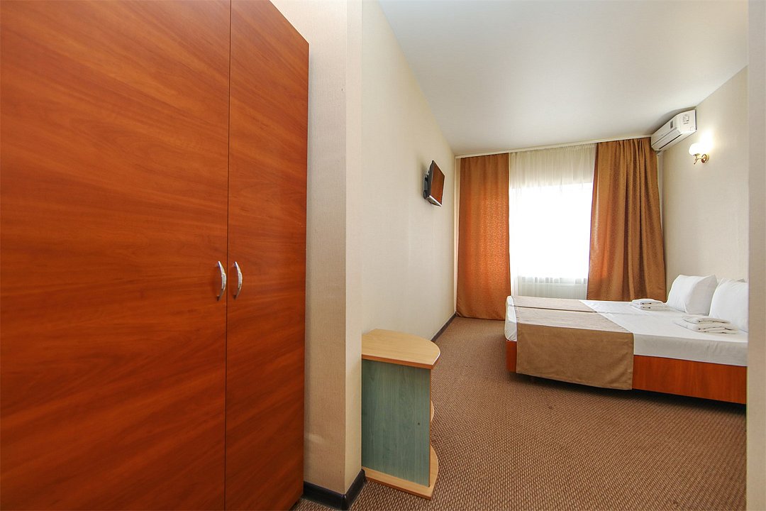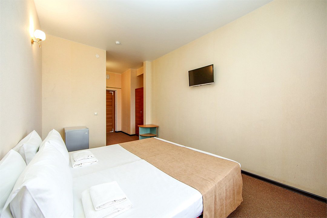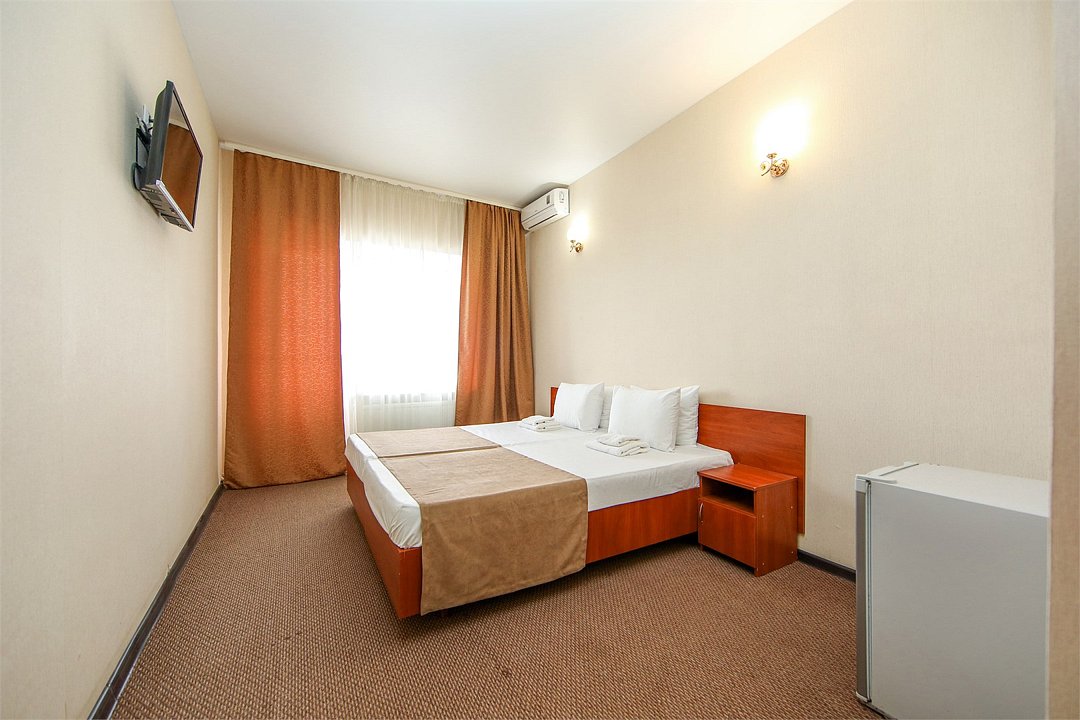 Описание и комплектация номера: Однокомнатный, двухместный номер с современным ремонтом. Площадь 15 м2. В номере: две односпальные кровати с возможностью объединения в односпальную кровать, прикроватные тумбочки, одёжный шкаф, кондиционер, холодильник, телевизор, фен, сейф, Wi-Fi. При размещении с маленькими детьми, бесплатно устанавливается детская кроватка. В качестве дополнительного места предоставляется евро раскладушка или кресло кровать. Из номеров открывается прекрасный вид на парк. Номера с балконами расположены на 1, 2, 3, и 5 этажах в основном корпусе «Family Resort».Услуги и удобства
