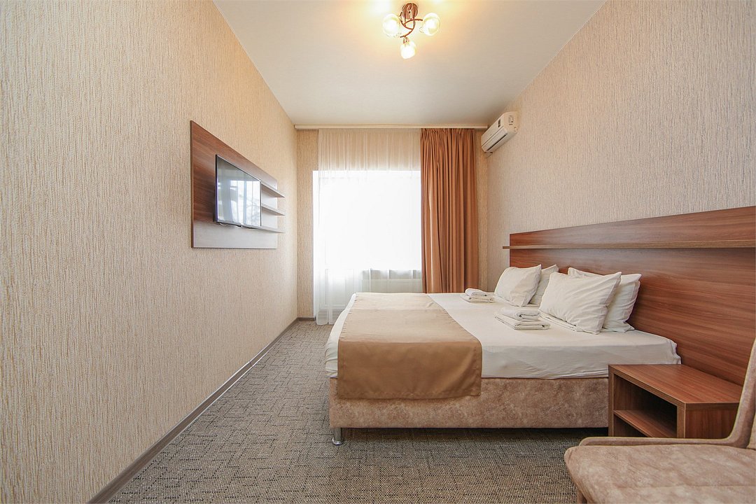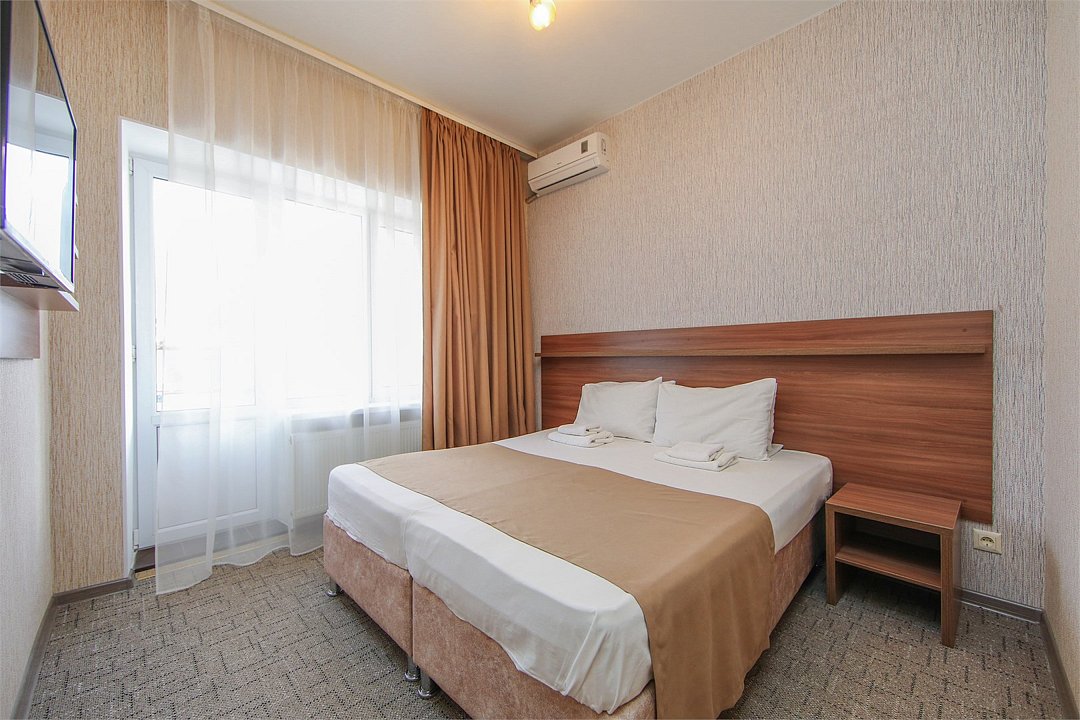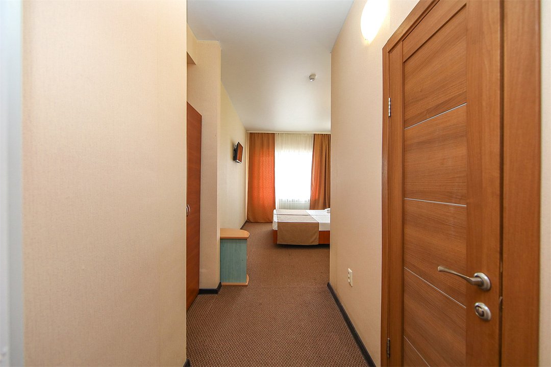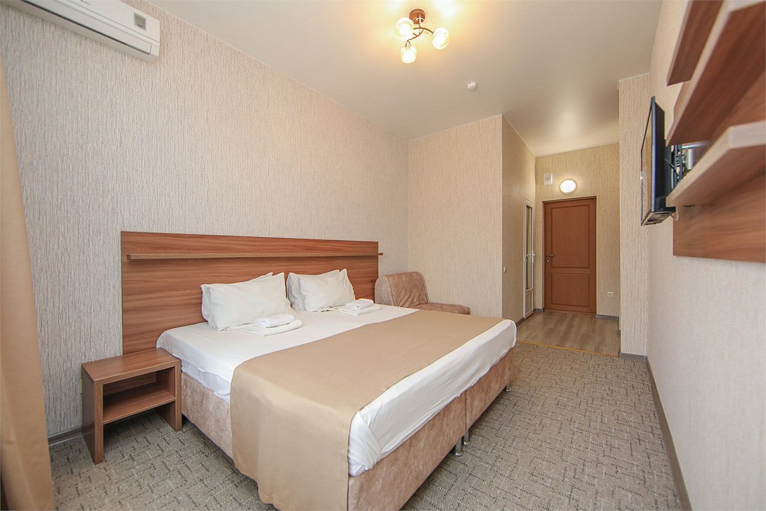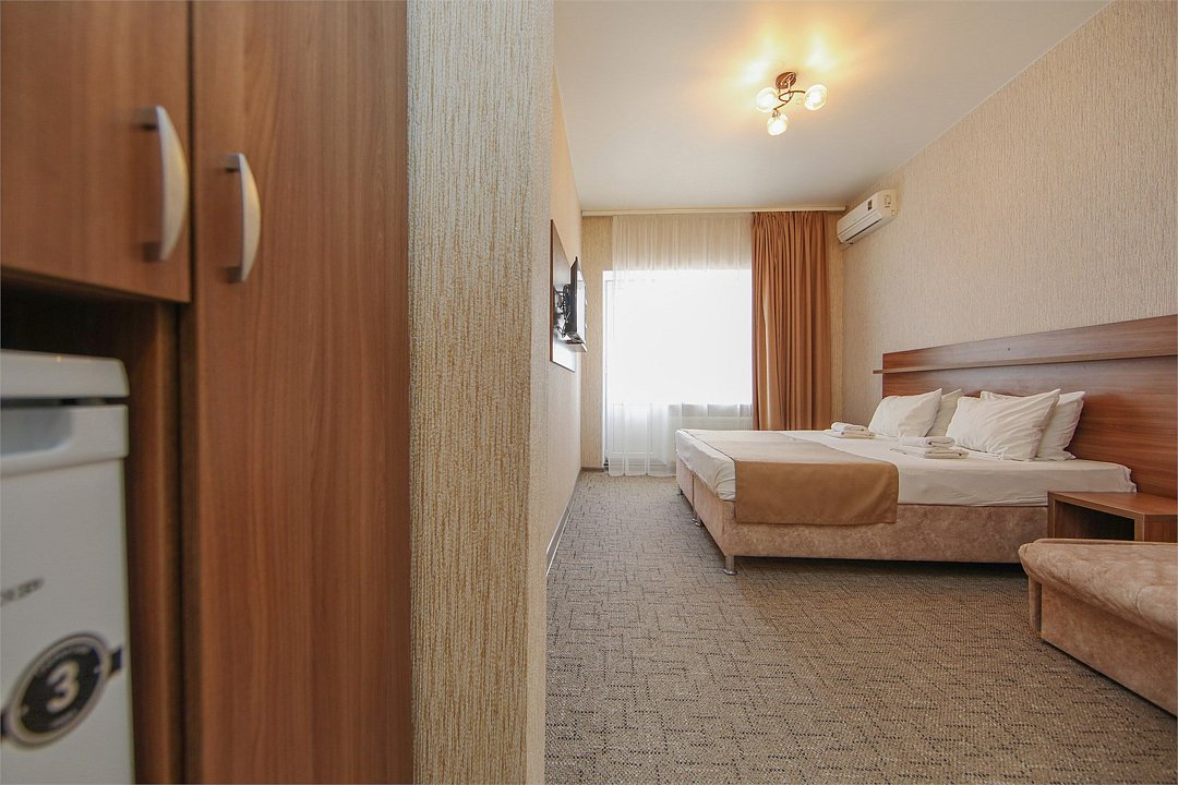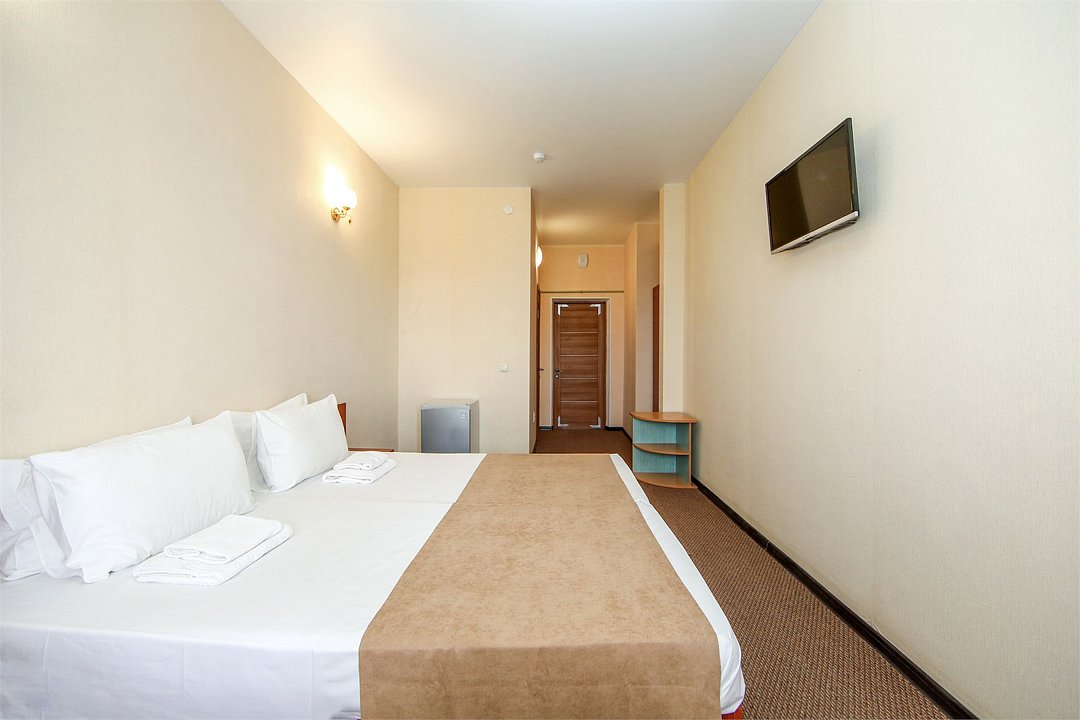 Описание и комплектация номера: Однокомнатный, двухместный номер с современным ремонтом. Площадь 15 м2. В номере: две односпальные кровати с возможностью объединения в односпальную кровать, прикроватные тумбочки, одёжный шкаф, кондиционер, холодильник, телевизор, фен, сейф, Wi-Fi. При размещении с маленькими детьми, бесплатно устанавливается детская кроватка. В качестве дополнительного места предоставляется евро раскладушка или кресло кровать. Из номеров открывается прекрасный вид на парк. Номера с балконами расположены на 1, 2, 3, и 5 этажах в основном корпусе «Family Resort».Услуги и удобства