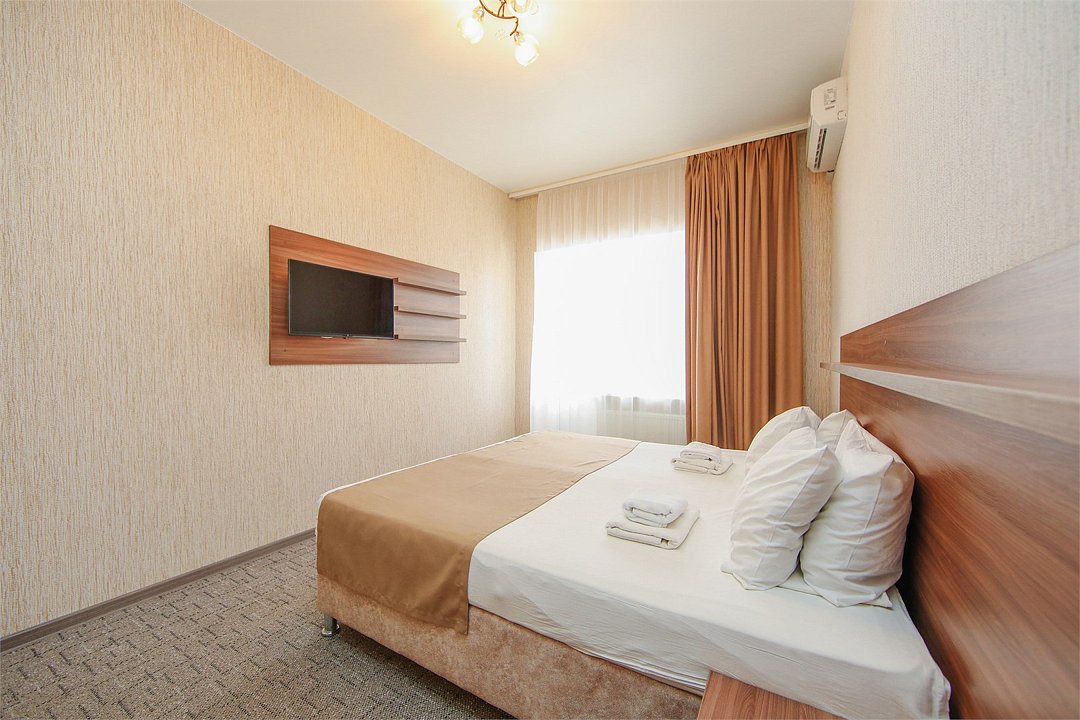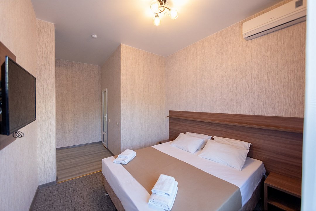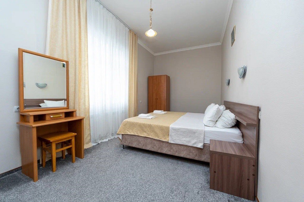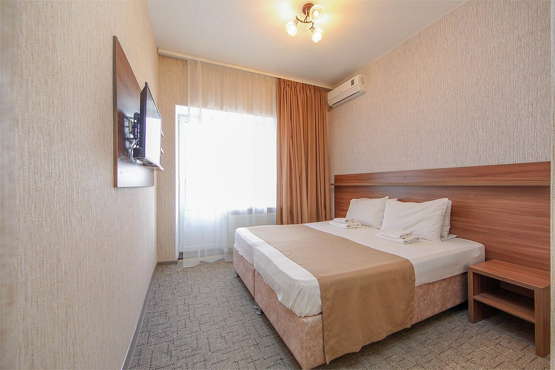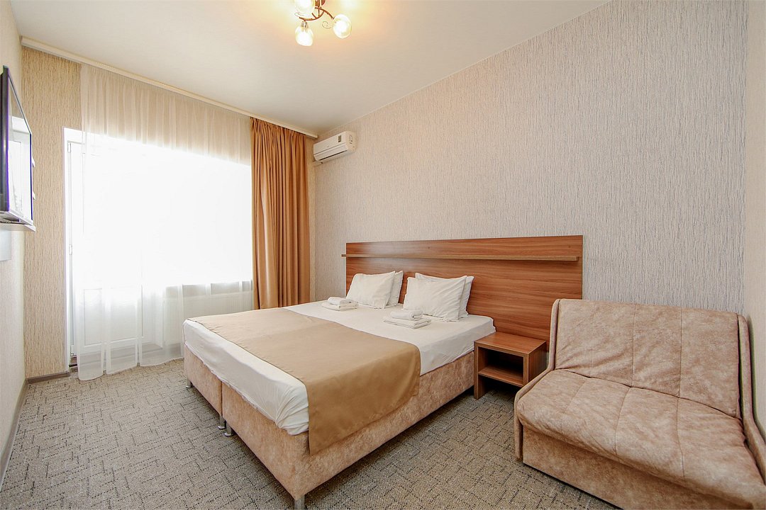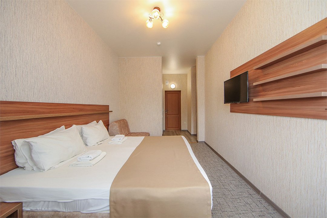 Описание и комплектация номера: Однокомнатный, двухместный номер с современным ремонтом. Площадь 15 м2. В номере: две односпальные кровати с возможностью объединения в односпальную кровать, прикроватные тумбочки, одёжный шкаф, кондиционер, холодильник, телевизор, фен, сейф, Wi-Fi. При размещении с маленькими детьми, бесплатно устанавливается детская кроватка. В качестве дополнительного места предоставляется евро раскладушка или кресло кровать. Из номеров открывается прекрасный вид на парк. Номера с балконами расположены на 1, 2, 3, и 5 этажах в основном корпусе «Family Resort».Услуги и удобства