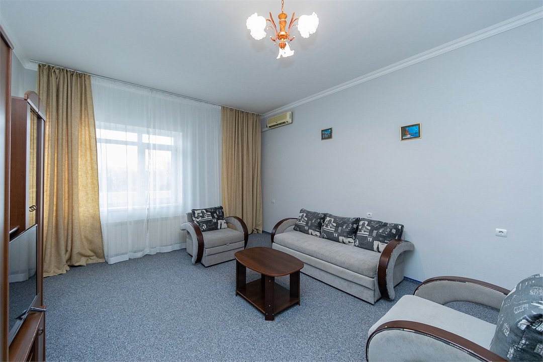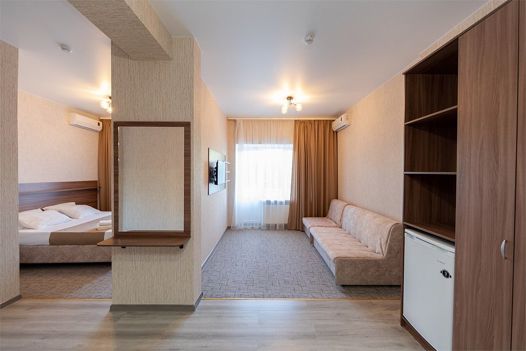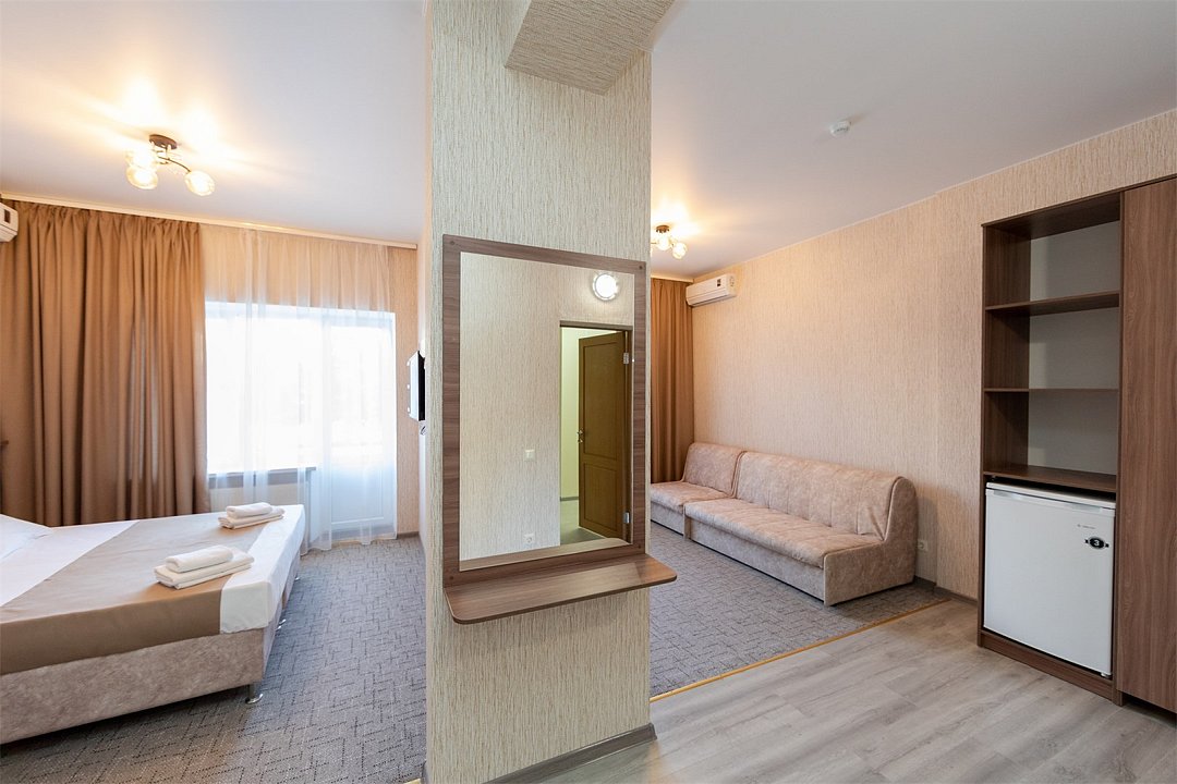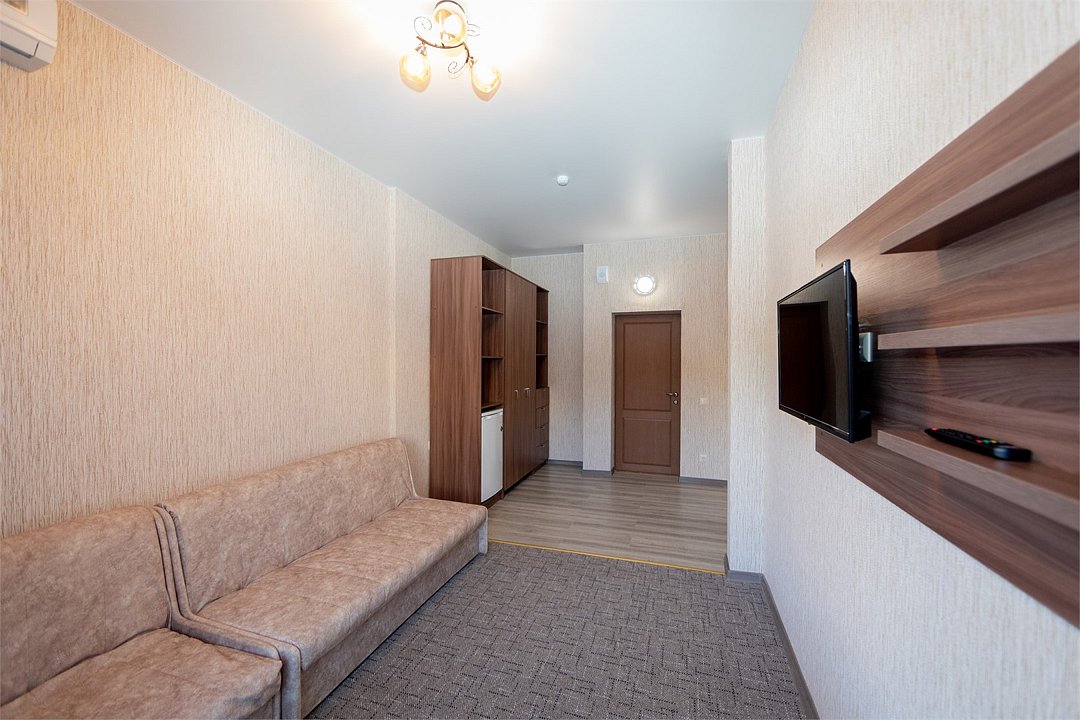 Описание и комплектация номера: Двухкомнатный просторный номер с современным ремонтом. Общая площадь 44 м2. В номере: две односпальные кровати с возможностью объединения в односпальную кровать, прикроватные тумбочки, шкафы, женский будуар, телевизоры, кондиционер, журнальный стол, фен, сейф, Wi-Fi. Во второй комнате установлены раскладной диван и кресло, которые используются как дополнительные спальные места. При размещении с маленькими детьми, бесплатно предоставляется детская кроватка, при размещении еще одного взрослого гостя устанавливается евро раскладушка. Номера с балконами расположены на 2, 3 и 4 этажах в корпусе «Апартаменты «Family». Корпус лифтом не оборудован.Услуги и удобства