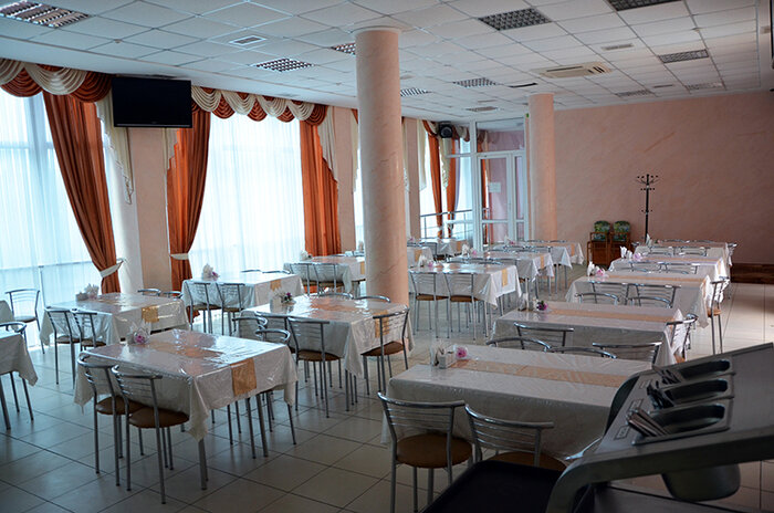 Зал столовой большой, просторный и уютный на 100 мест, со светоэфектами, можно использовать для проведения банкетов, свадеб, юбилеев. Завтрак, обед и ужин можно приобрести на ваш выбор за отдельную плату.