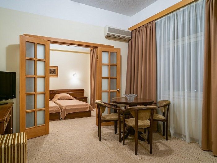 «Полулюкс» представляет собой комфортабельный номер, включающий в себя спальную и гостиную комнаты, есть балкон. Кровати в номере на Ваш выбор одна большая или две раздельные. В номере есть все необходимое для комфортного проживания двух человек.Услуги и удобства
