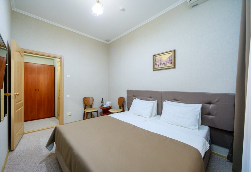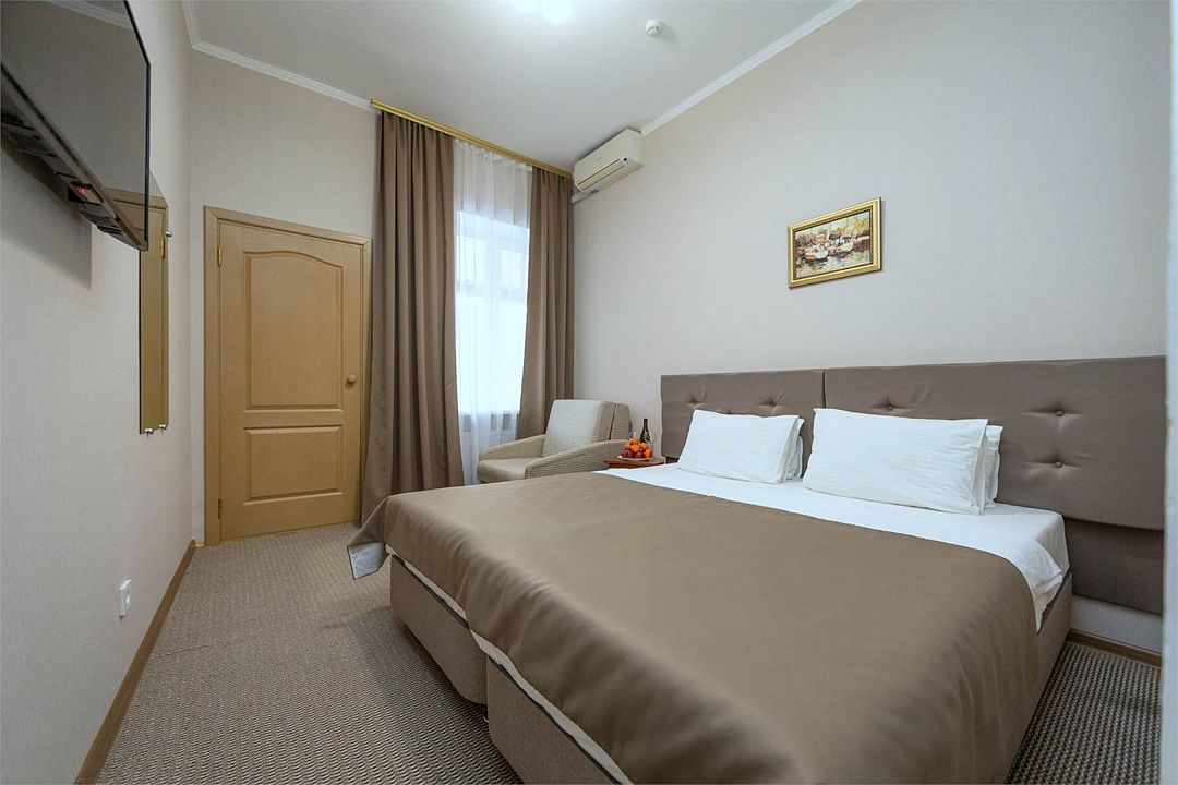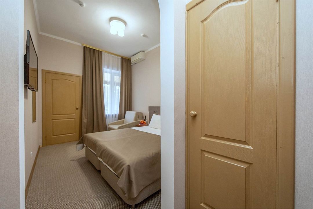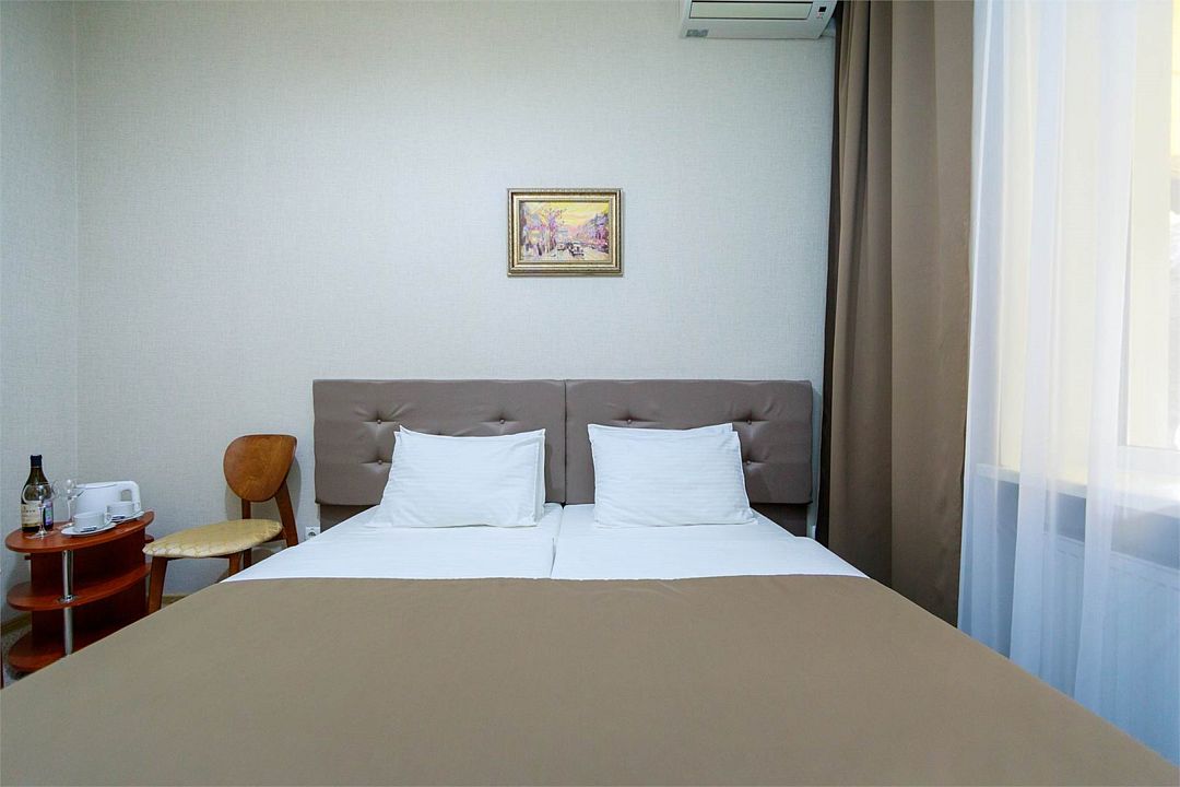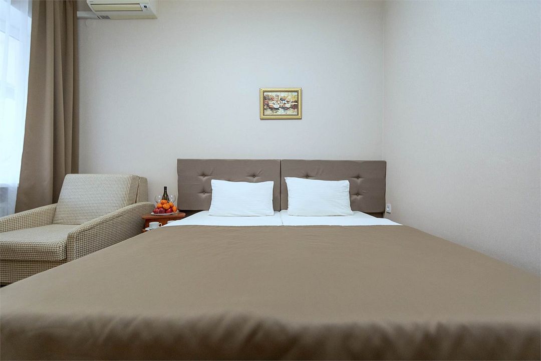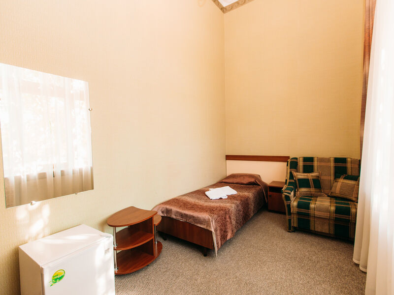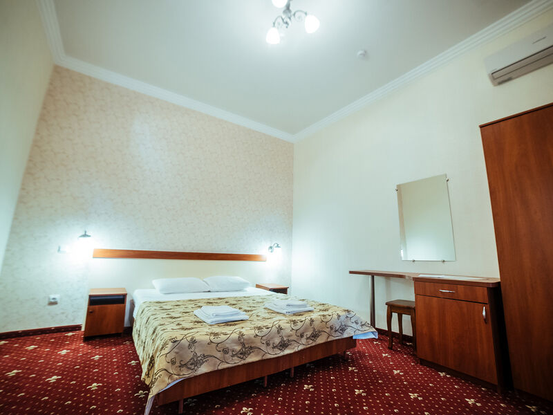 Однокомнатный двухместный номер. Общая площадь 15 м2. В номере: две односпальные кровати с возможностью объединения, кресло-кровать, одёжный шкаф, прикроватные тумбочки, кондиционер, холодильник, телевизор, сейф, электрочайник, Wi-Fi. Холодное и горячее водоснабжение круглосуточно. Возможно размещение на дополнительном месте. Дополнительным местом в номере является кресло-кровать или еврораскладушка. При размещении с маленькими детьми, бесплатно устанавливается детская кроватка. Все номера данной категории расположены на первом этаже с отдельным входом.Услуги и удобства