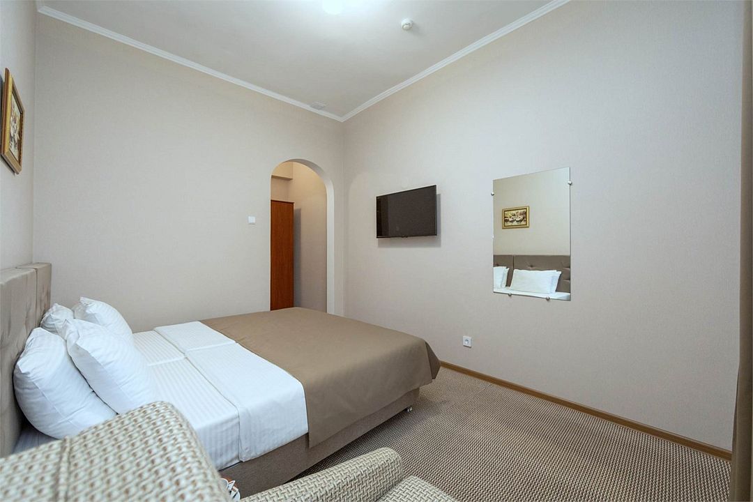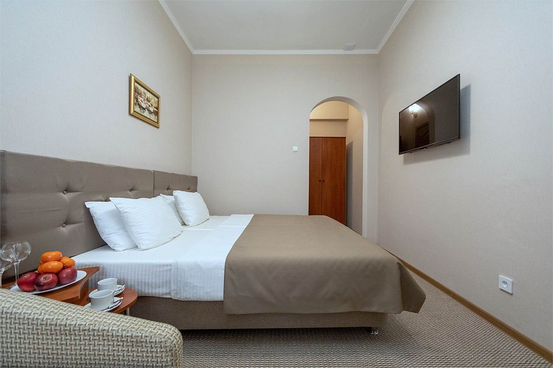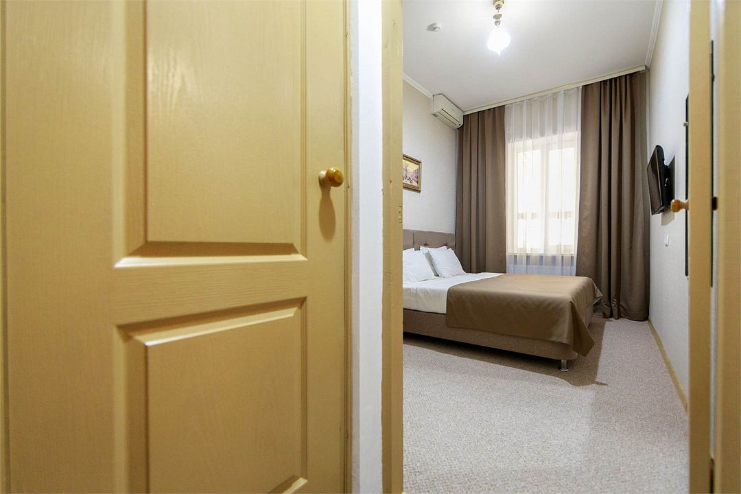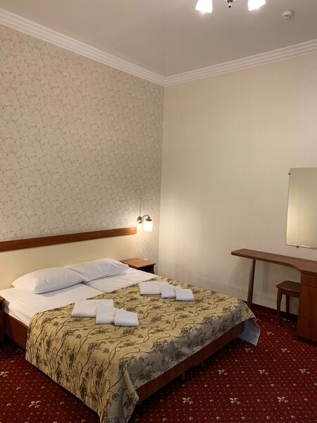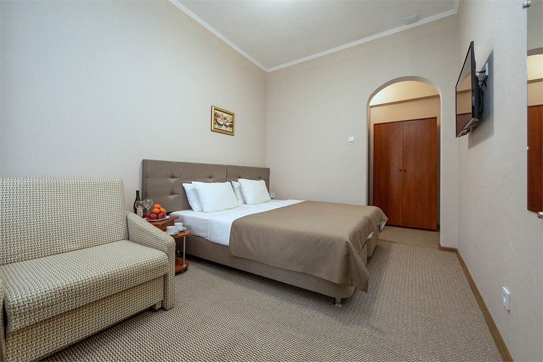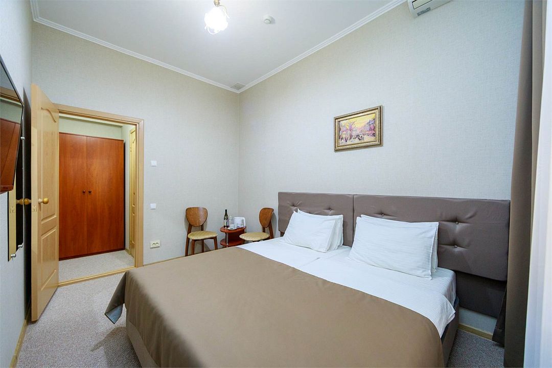 Однокомнатный двухместный номер. Общая площадь 15 м2. В номере: две односпальные кровати с возможностью объединения, кресло-кровать, одёжный шкаф, прикроватные тумбочки, кондиционер, холодильник, телевизор, сейф, электрочайник, Wi-Fi. Холодное и горячее водоснабжение круглосуточно. Возможно размещение на дополнительном месте. Дополнительным местом в номере является кресло-кровать или еврораскладушка. При размещении с маленькими детьми, бесплатно устанавливается детская кроватка. Все номера данной категории расположены на первом этаже с отдельным входом.Услуги и удобства