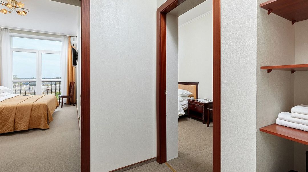 Обновленный, просторный двухкомнатный семейный номер с гостевым холлом и одной ванной комнатой — идеальное решение для отдыха семьей или небольшой компанией. (Высшая категория "Джуниор сюит") Номер оснащен всем необходимым для вашего комфорта: - Удобные кровати с ортопедическими матрасами для здорового сна; - Телевизор со спутниковым подключением; - Индивидуальная система кондиционирования; - Телефон; - Холодильник; - Электронный сейф; - Высокоскоростной Wi-Fi. Также предусмотрено дополнительное спальное место — современная еврораскладушка. TES Hotel Resort & SPA предлагает вам не только уютные номера, но и великолепные возможности для отдыха: один из лучших двухэтажных СПА-комплексов в Крыму, изысканный ресторан, медицинский центр с современным оборудованием от мировых брендов, зал лечебной физкультуры и, конечно же, теплый прием нашего гостеприимного персонала. Следите за нашими акционными предложениями и гибкими тарифами на официальном сайте отеля, чтобы сделать ваш отдых еще более приятным и выгодным. Мы всегда рады встречать вас и ваших близких в нашем отеле!Услуги и удобства