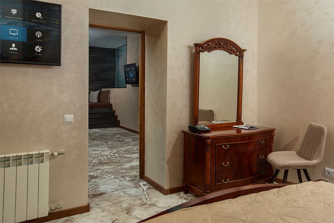 спутниковое телевидение, Wi-Fi, интернет, телефон, кондиционер, светильник, настольные лампы, фен, система безопасности, электронные замки, утюг, ванная комната, душевая кабина, санузел, биде, халаты, тапочки, гигиенические средства, косметические средства, кровать «Queen size», двуспальная кровать, односпальная кровать, гладильная доска, ортопедический матрас, диван, кресла, тумбы, стулья, шкаф для одежды, гардеробная, вешалки, зеркало, эксклюзивная мебель, мебельный гарнитур, две комнаты, звуконепроницаемые стены и окна, чайный набор, набор посуды, обслуживание номеров, сейф, чайник, раковина, мягкая мебель, косметическое зеркало, питьевая вода, обеденная зона, гостиная зона, ковровое покрытие, кресло, две спальни, высокие потолки, кухонная посуда, стаканы, столовые приборы, туалетный столик, кофейный столик, стул, стол, туалетный столик, туалетные средства, сплит-система, внутренний телефон, телевизор с плоским экраном, мини-холодильник, кухонный уголок, гостиничная парфюмерия, мансардные окна, фанкойл, без питомцевВ гостиничном номере