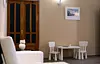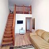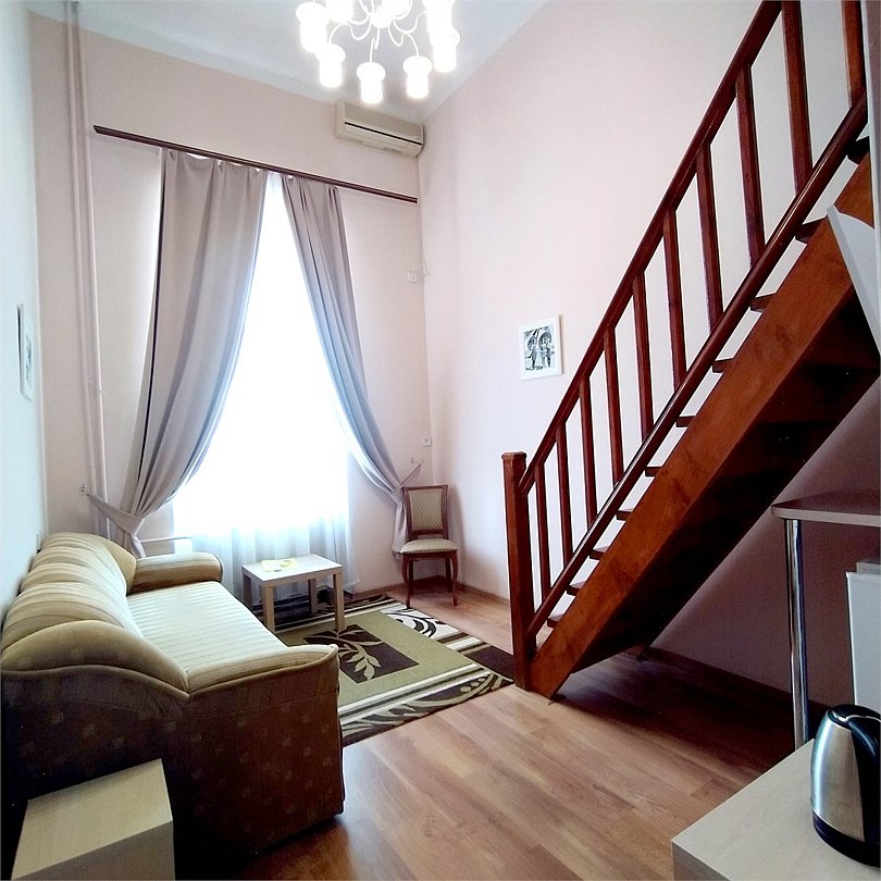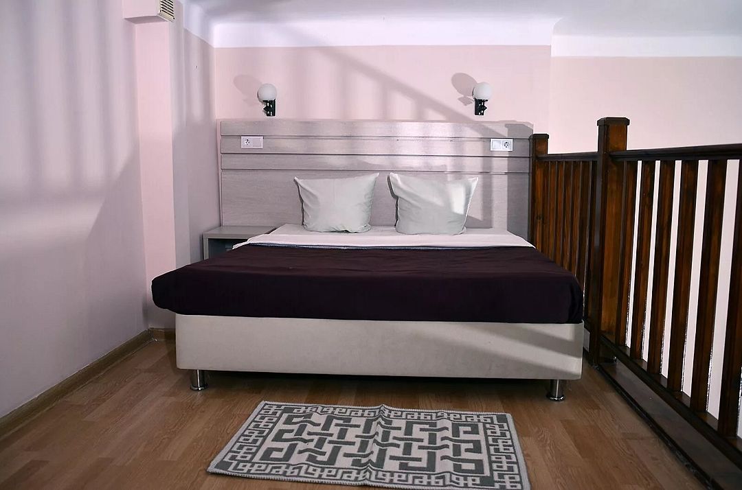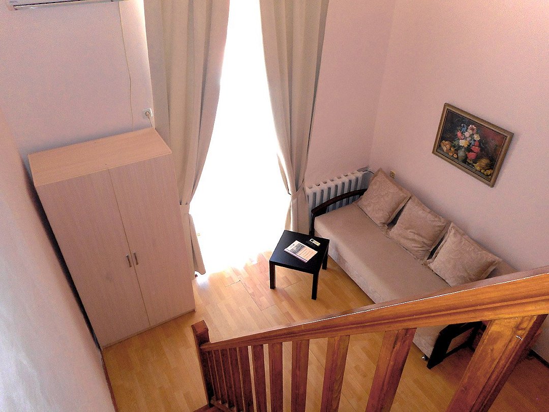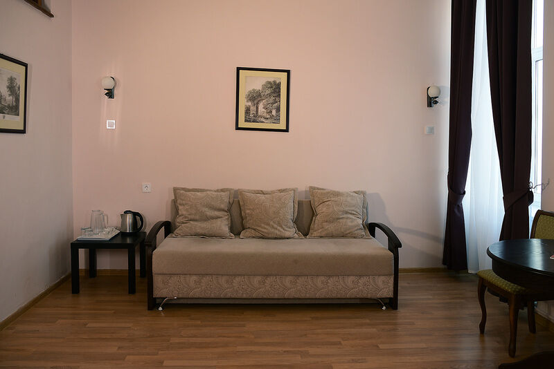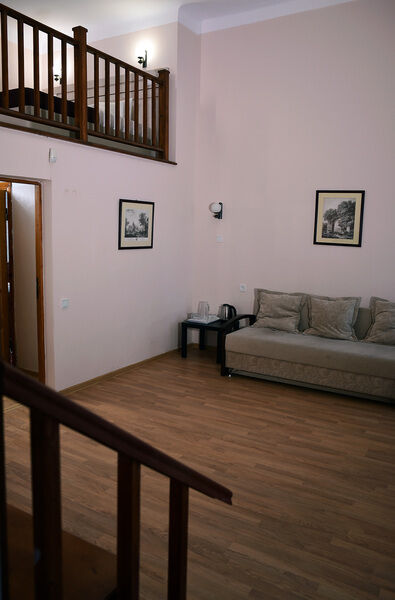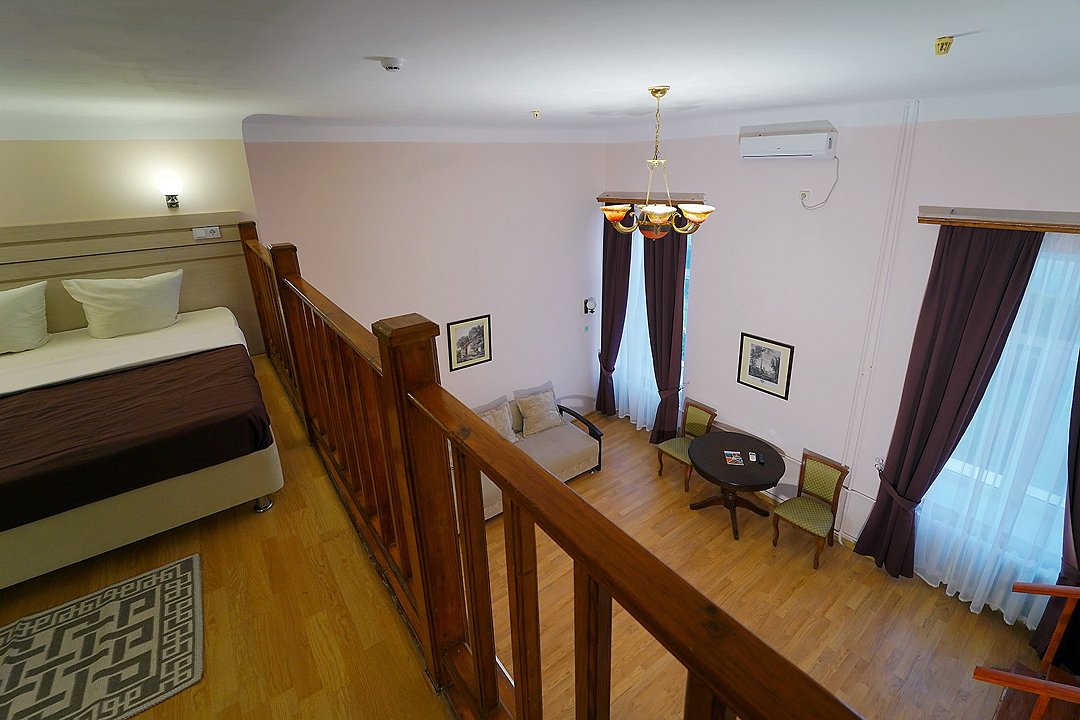 Двухуровневые номера с видом во внутренний дворик, с балконом. На первом уровне — гостиная с диваном, на втором — кровать.