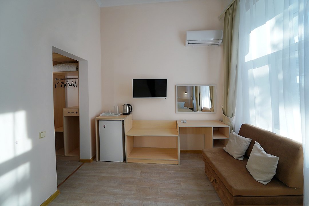 Просторный номер с видом на море. Светлые стены и большие окна создают атмосферу свежести и уюта. Из номера есть выход на балкон, где можно наслаждаться восхитительными закатами и свежим морским воздухом.