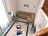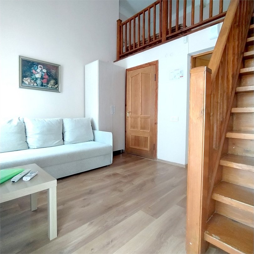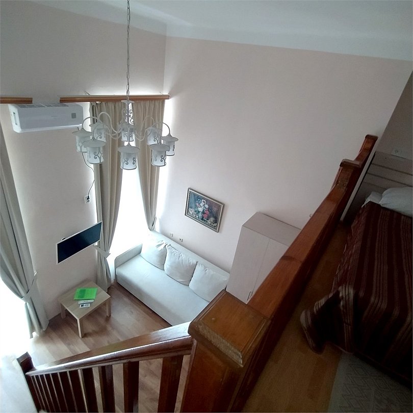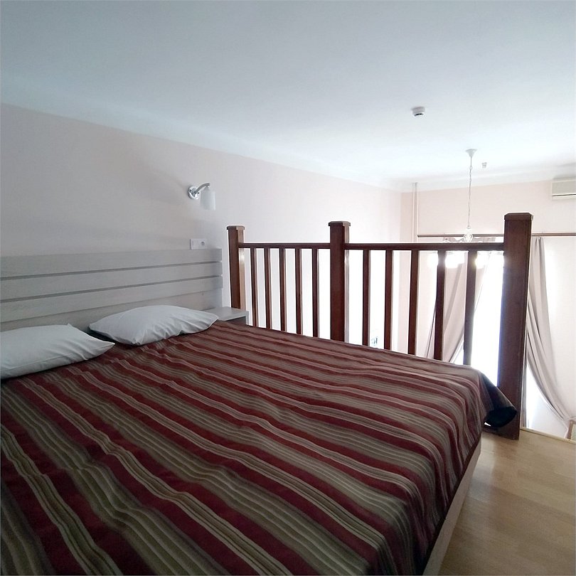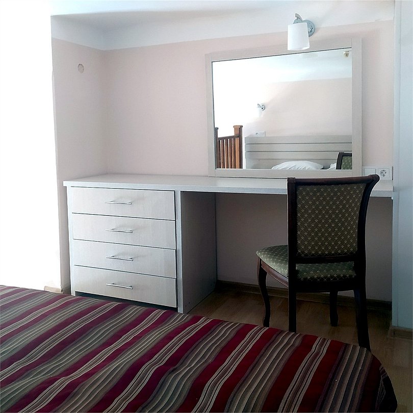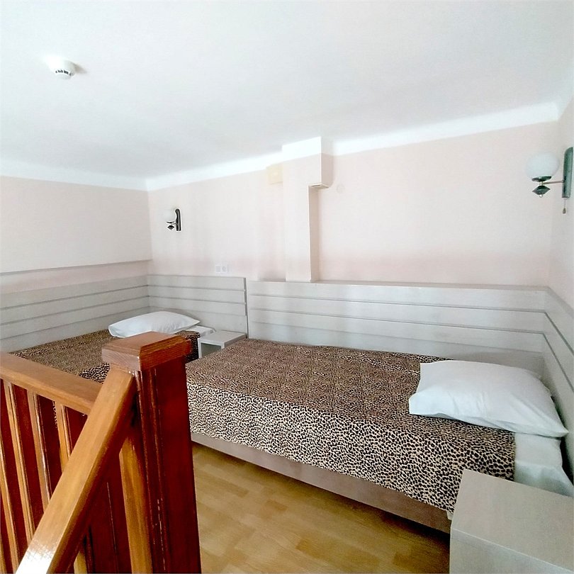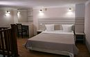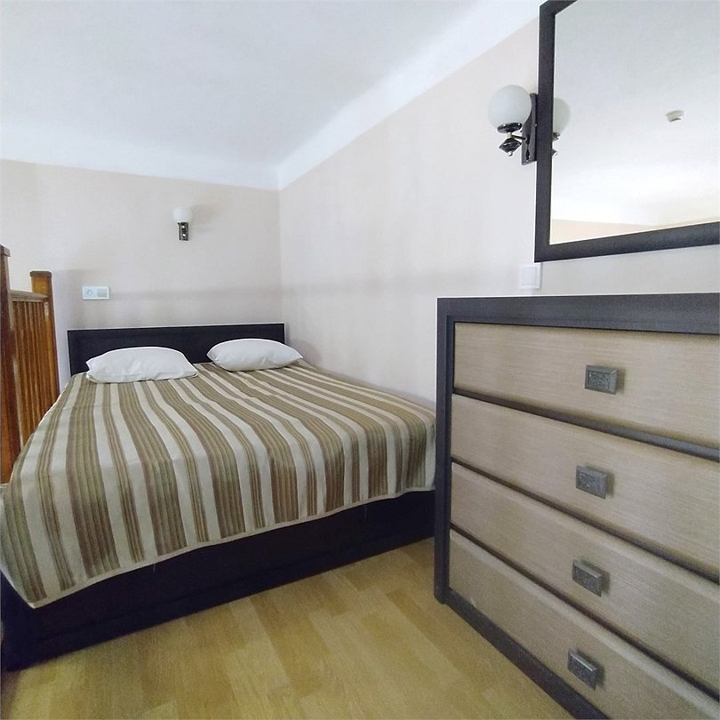 Двухуровневый номер с видом на море, без балкона. На первом этаже диван и кровать (расположена в небольшом алькове), обеденный стол со стульями, шкаф, зеркало, на втором этаже — кровать, комод.