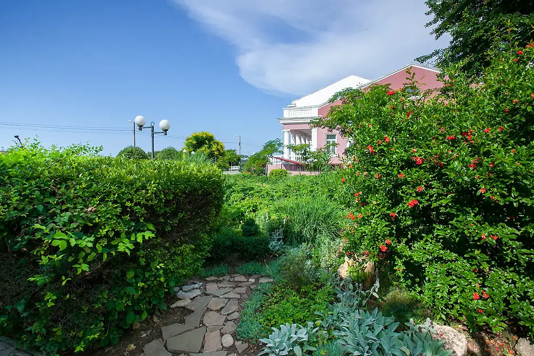 Территория пансионата очень понравилось, очень ухоженные растения, все прям идеально. Вечером есть где прогуляться, рядом парк и рынок и набережная. Аптеки и магазины и кафе. Конечно забор вдоль моря портит впечатление, но это не вина пансионата.